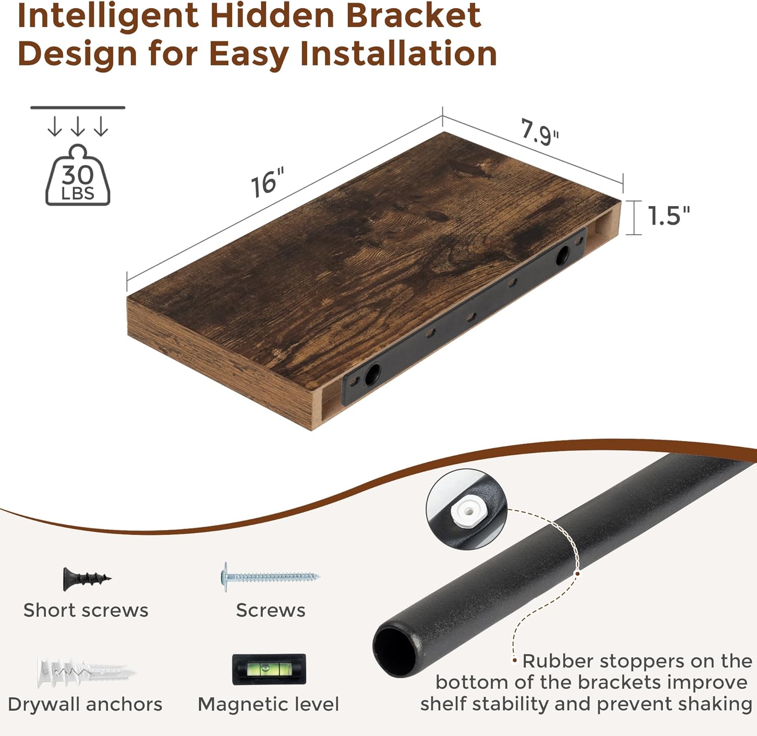 - 【Easy To Install】This rustic brown floating shelves not only come with stainless-steel galvanized invisible brackets, but also equipped a fixing screw at the bottom to fix the shelf on the support rod, which solves the problem of sliding and is not easy to damage, and can be used for a long time. Instructions, magnetic level, drywall anchors, and screws included.