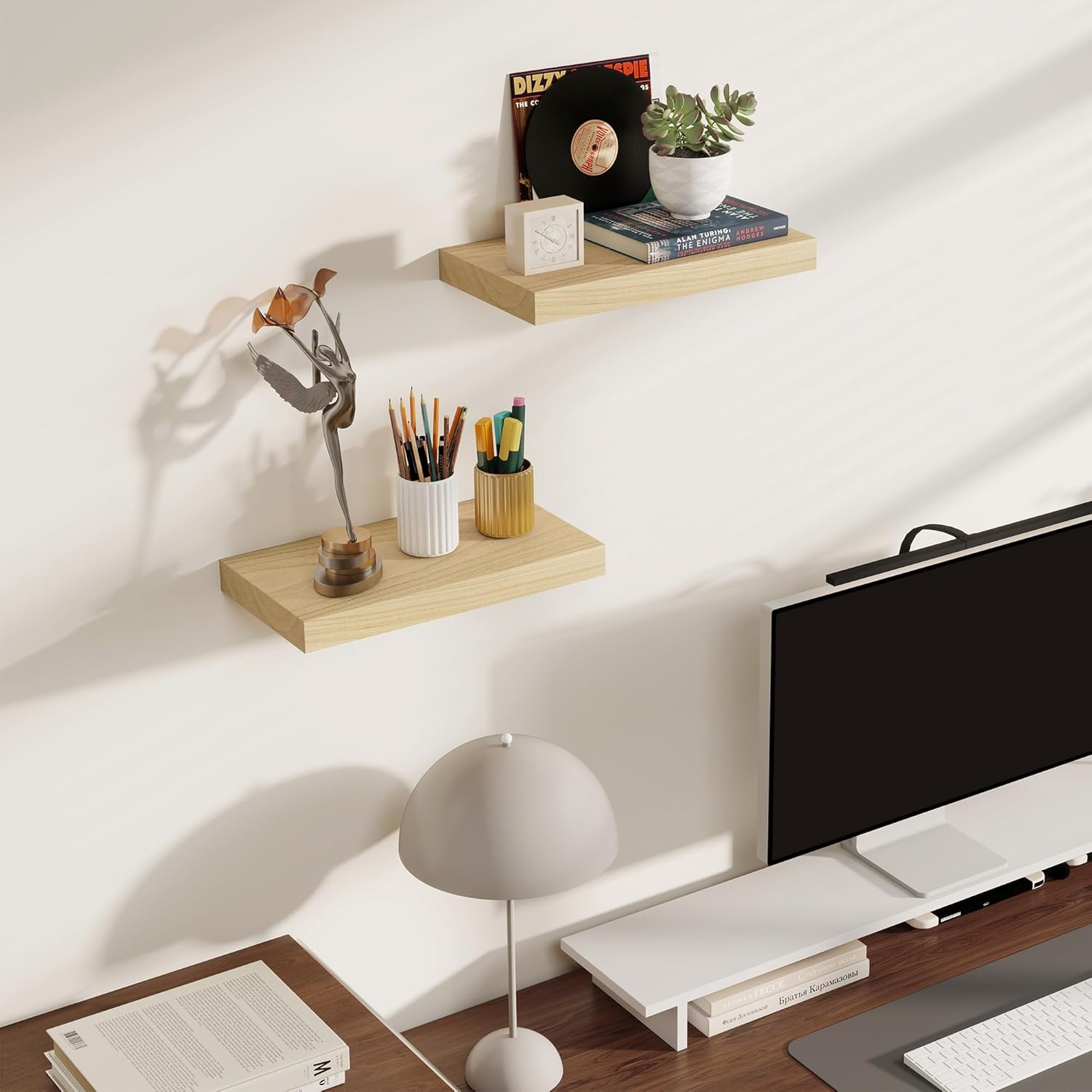 - 【DECORATIVE & FUNCTIONAL】The wall-mounted floating shelves are designed for decoration and storage, utilizing and decorating any space in your home. Used as shelf decor to show your collection, books, or prize, the hanging shelves are perfect for displaying your photo frame, small plants, model, or audio in your living room, office, study. And can also use as over the toilet storage shelf in the bathroom to hold toiletries or used as kitchen shelf to storage condiments.