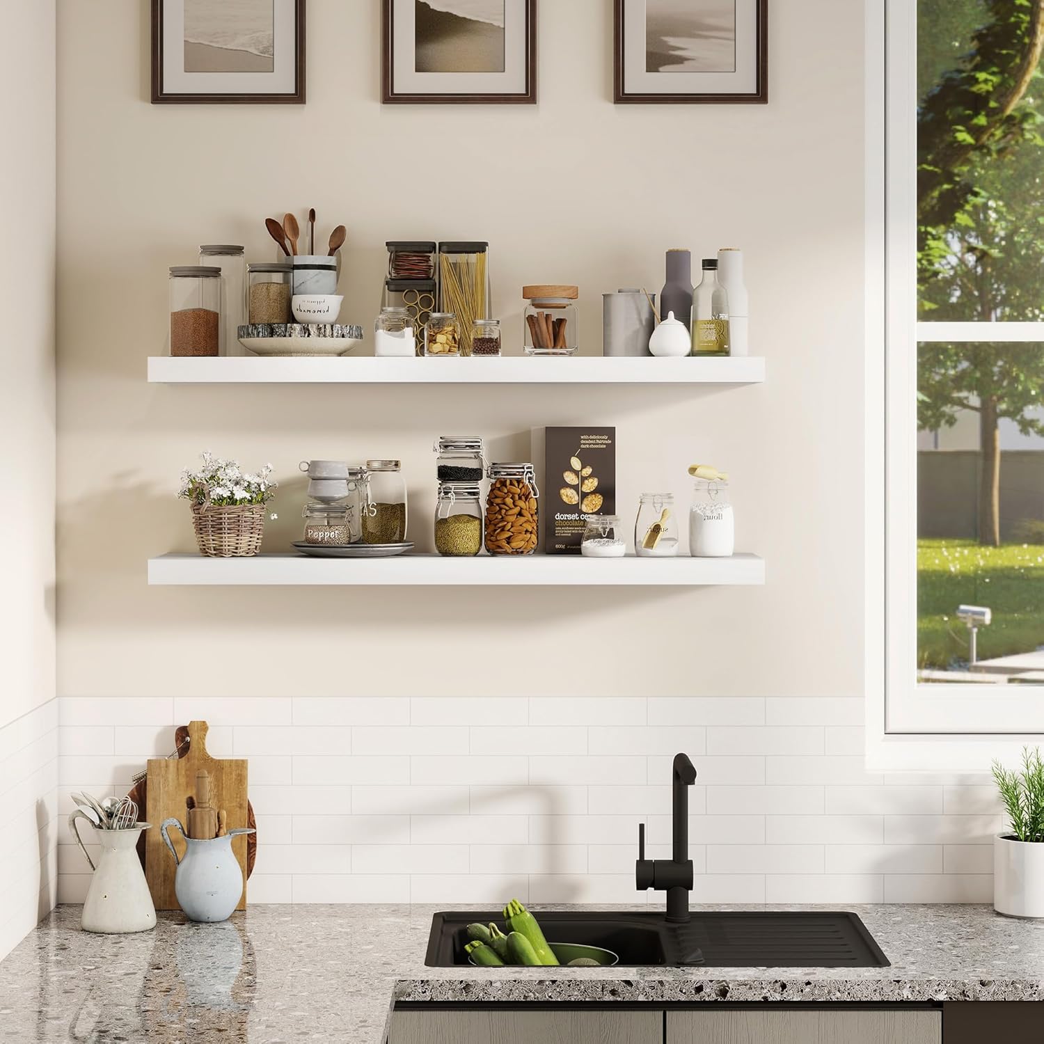 - 【DECORATIVE & FUNCTIONAL】The wall-mounted floating shelves are designed for decoration and storage, utilizing and decorating any space in your home. Used as shelf decor to show your collection, books, or prize, the hanging shelves are perfect for displaying your photo frame, small plants, model, or audio in your living room, office, study. And can also use as over the toilet storage shelf in the bathroom to hold toiletries or used as kitchen shelf to storage condiments.