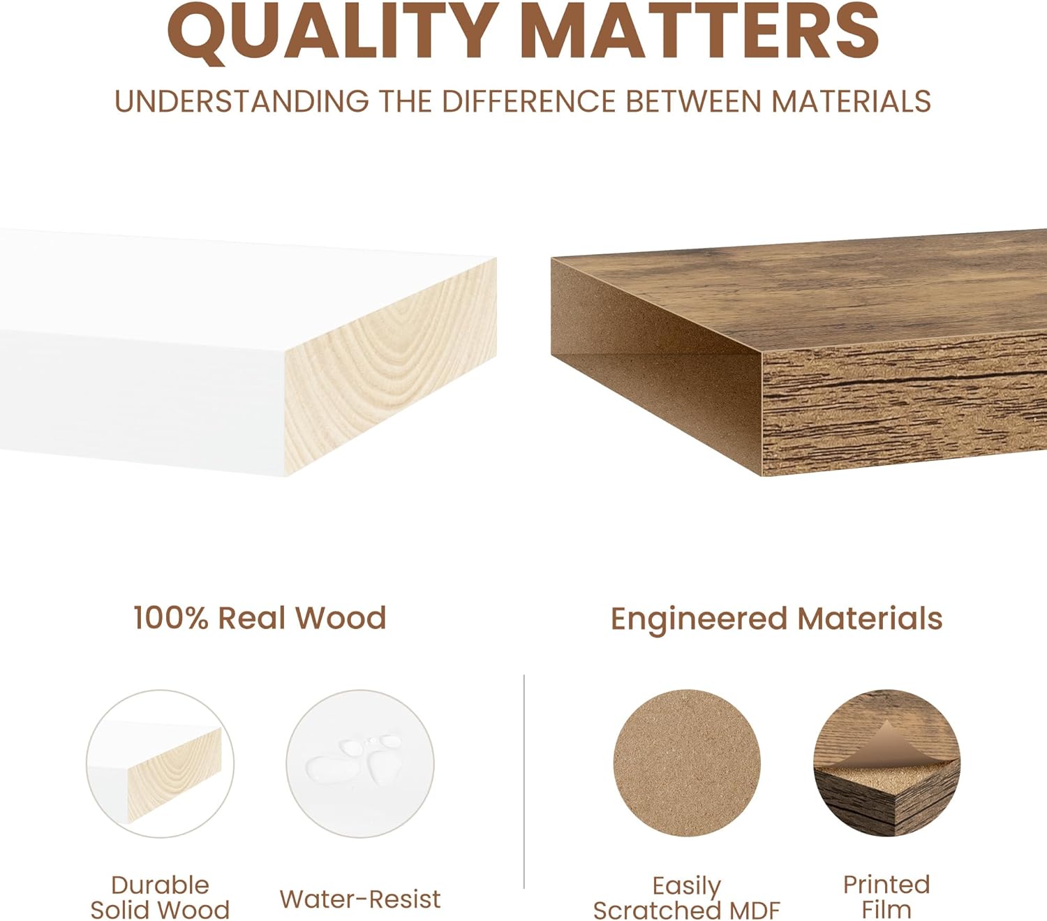 - 【SOLID WOOD FLOATING SHELVES】These wooden shelves are made of real solid Paulownia Wood with natural wooden node and grain, We deliberately retain the wood texture on the surface to create a natural and warm feelings that suit your various home decorations. The lightweight wood material is specially selected, which won't add too much burden to the wall, is better for wall-mounted stability.