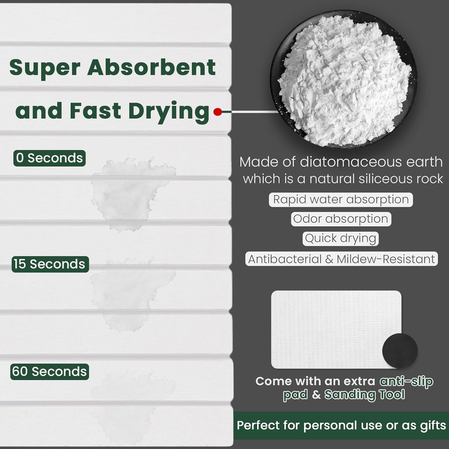 - Natural Diatomite Dish Drying Mat: Crafted from premium natural diatomaceous earth, this stone drying mat delivers exceptional absorbency. It instantly wicks away residual water from freshly washed dishes, protecting countertops dry and spotless, and effectively prevents musty odors caused by moisture. Compared to standard silicone or fabric mats, this stone-like mat offers superior durability and excellent heat resistance