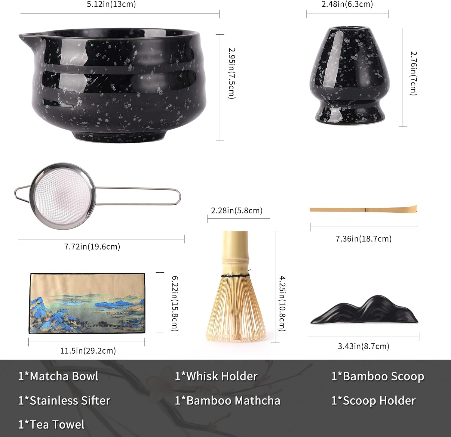 - Complete Kit: Includes: Ceramic matcha bowl with spout Handmade bamboo whisk + ceramic whisk holder Stainless steel sifter, bamboo scoop, ceramic scoop stand, absorbent cloth.