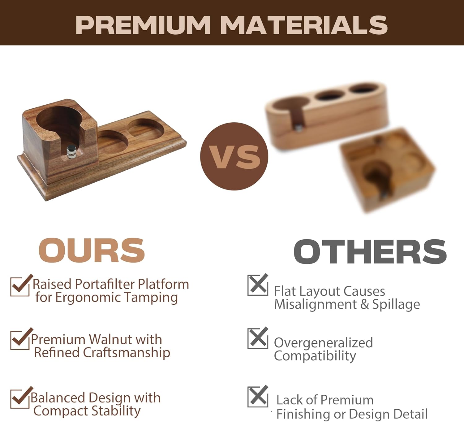 - Premium Walnut Wood – Crafted from rich, natural walnut, this coffee tamping station showcases elegant wood grain patterns, combining rustic charm with modern durability. Each piece has its own unique character.