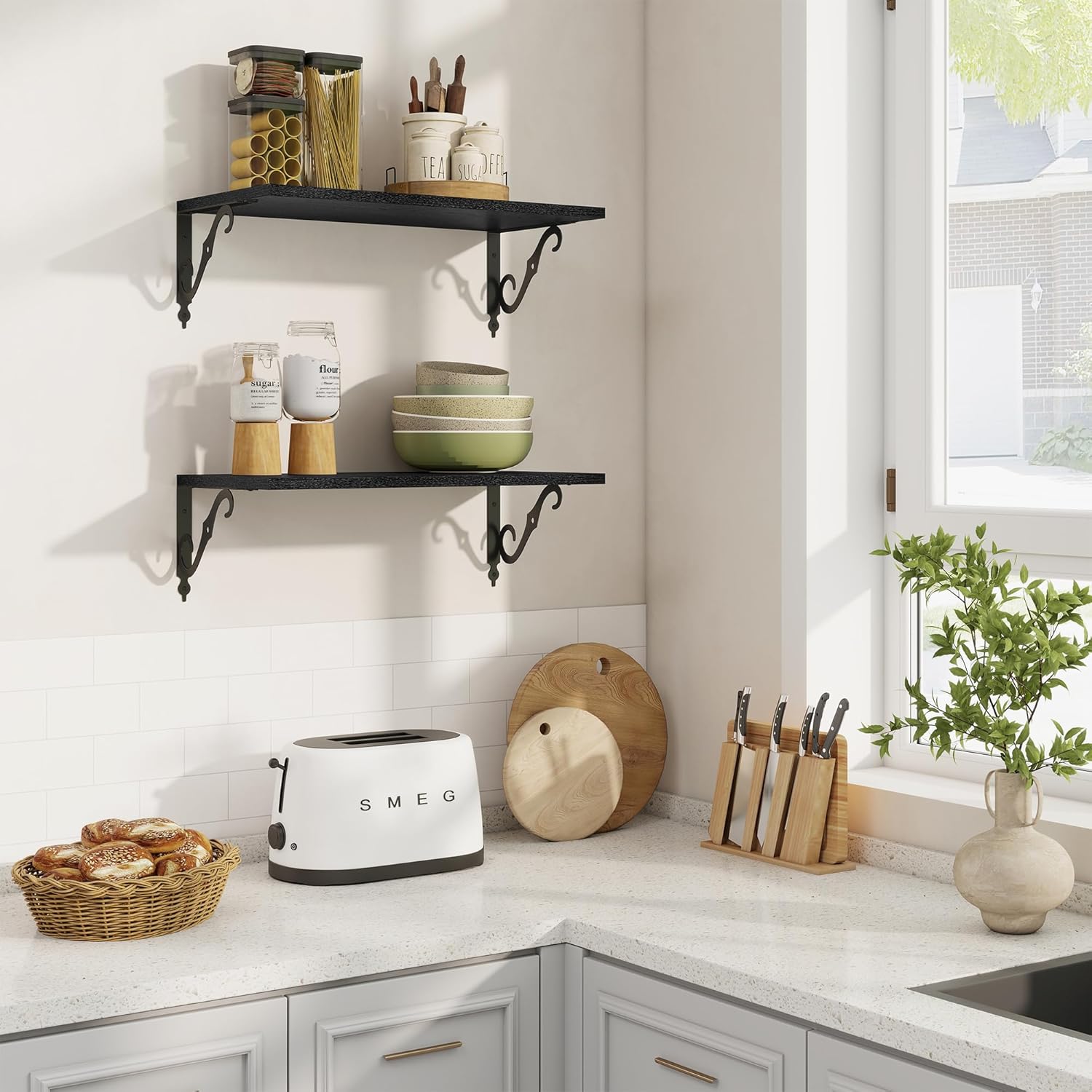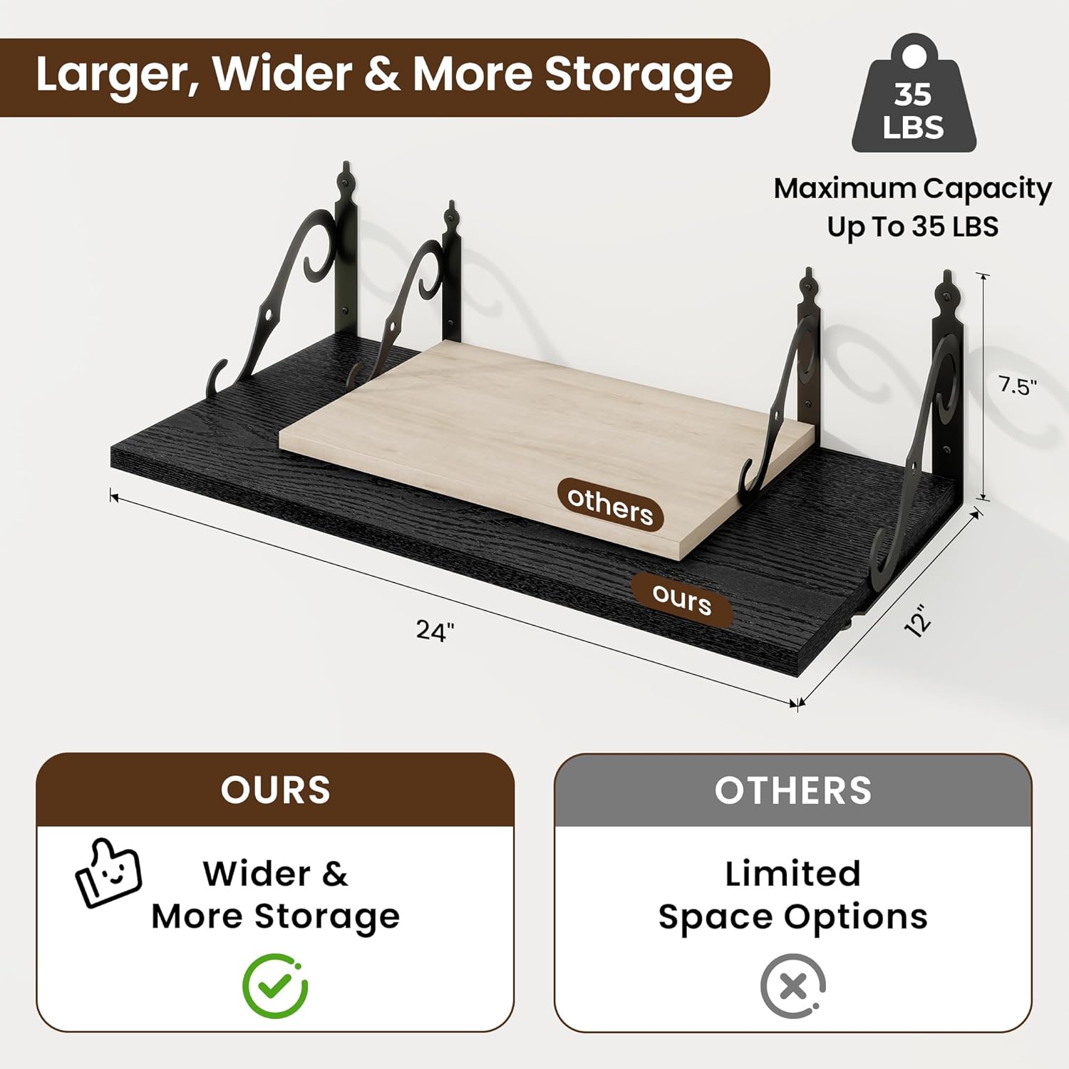 - 12 Inch Deep Floating Shelves: Our rustic deep floating shelves are made of high-quality particle board and sturdy brackets. The classic S-shaped brackets are designed to prevent sagging and ensure long-lasting stability. All edges are carefully sanded for a smooth finish