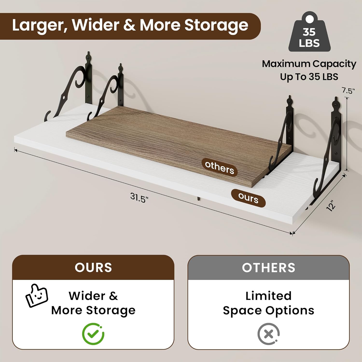 - 12 Inch Deep Floating Shelves: Our rustic deep floating shelves are made of high-quality particle board and sturdy brackets. The classic S-shaped brackets are designed to prevent sagging and ensure long-lasting stability. All edges are carefully sanded for a smooth finish