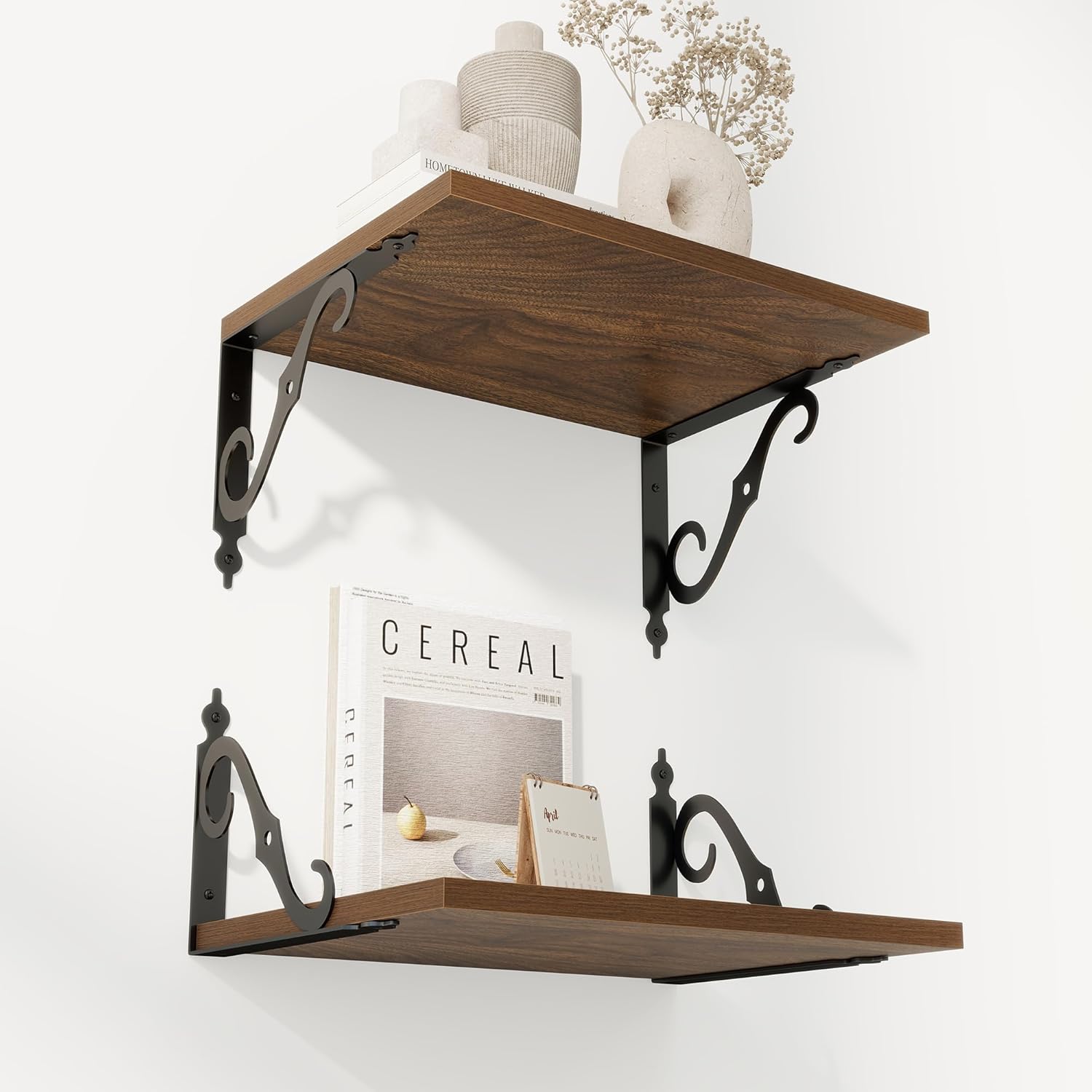 - Perfect Home Decor: This wood shelf fits rustic style, or vintage style home decor, rustic wood grain and exquisite S-shaped brackets will make your home full of modern and elegant romance. Our floating shelf makes full use of the wall, and let your room and bathroom look so cute. The bracket can be installed above or below the board according to space and usage to create your unique home style