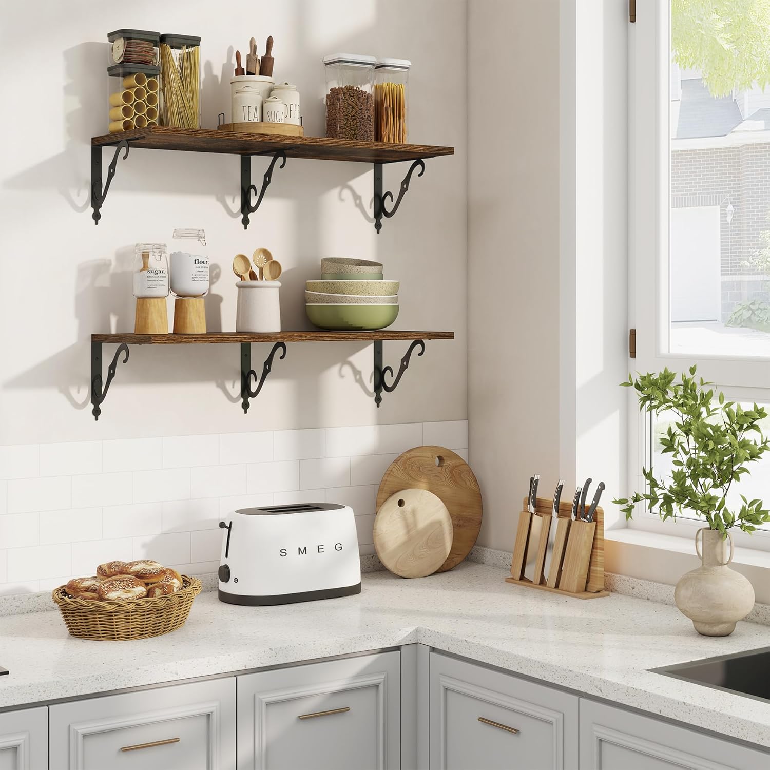 - 12 Inch Deep Floating Shelves: Our rustic deep floating shelves are made of high-quality particle board and sturdy brackets. The classic S-shaped brackets are designed to prevent sagging and ensure long-lasting stability. All edges are carefully sanded for a smooth finish