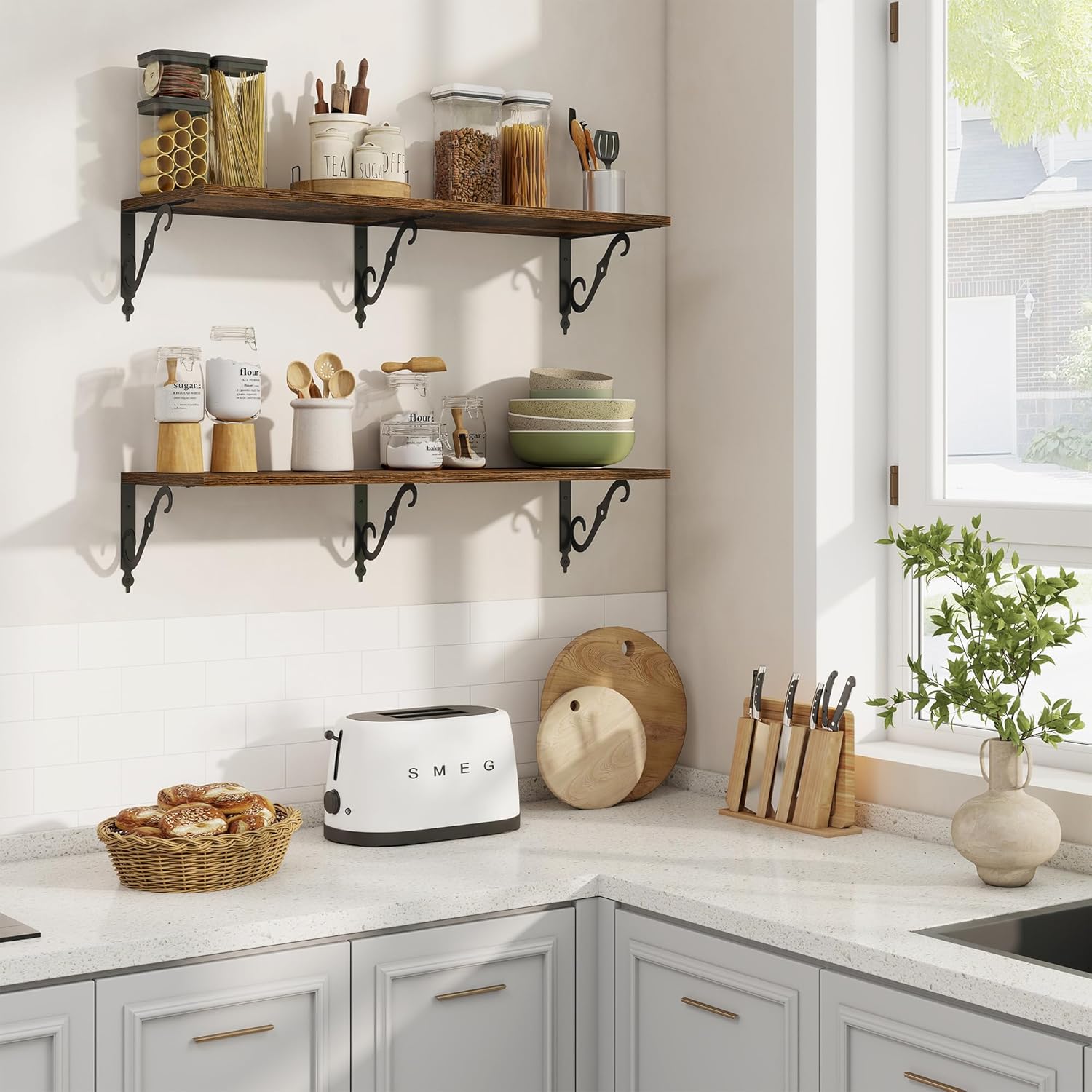 - 12 Inch Deep Floating Shelves: Our rustic deep floating shelves are made of high-quality particle board and sturdy brackets. The classic S-shaped brackets are designed to prevent sagging and ensure long-lasting stability. All edges are carefully sanded for a smooth finish