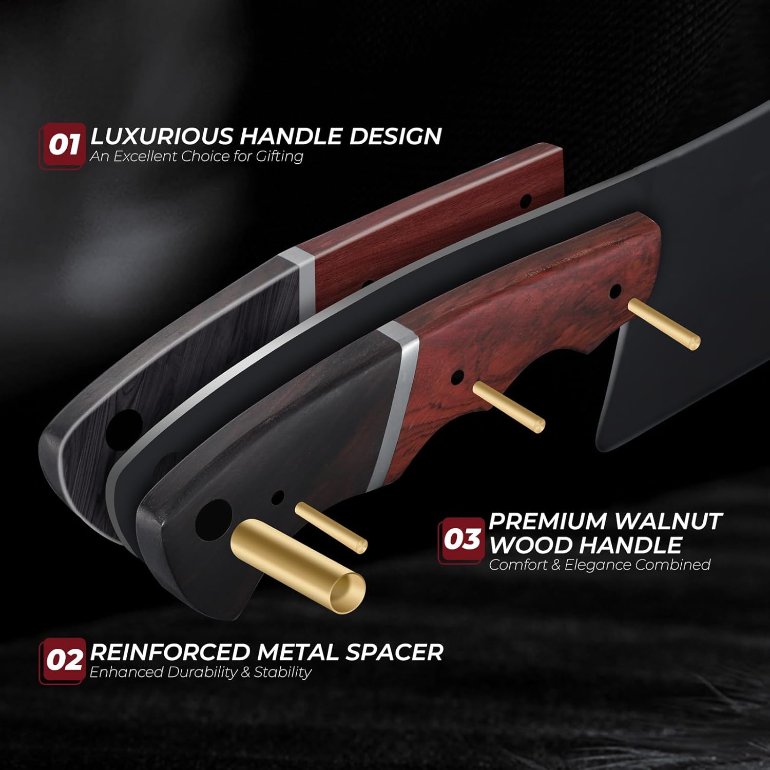 - Ergonomic Walnut Handle – Designed for Comfort & Control.Combining natural elegance with superior ergonomics, the hand-polished walnut wood handle features a sculpted finger groove for a secure, fatigue-free grip. Reinforced with a metal spacer and full-tang structure, it offers balance, durability, and long-term comfort. Whether you're slicing or chopping, this handle provides the control professionals demand with the style you’ll love.