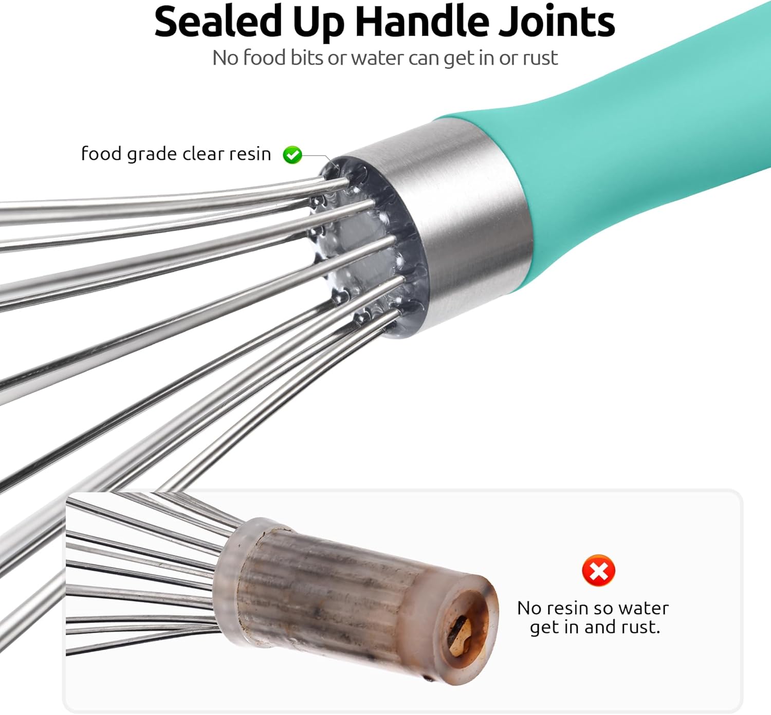- [Sealed Up with Clear Food Grade Resin] U-Taste balloon whisk is sealed up around the base of the wires where they join the handle with food grade resin to ensure that the no food bits or water can get in or rust. You can use this metal whisk for beating, whisking and whipping task without worrying about the food get caught up in the handle and wire. The right size for scrambling a few eggs and mixing salad dressings, making personal servings of dishes, blending sauces and making hot chocolate.