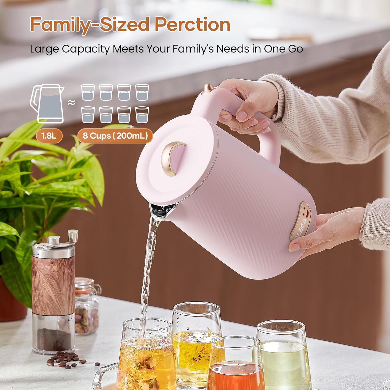 - Family-Sized 1.8L Capacity – Whether it’s tea time for the whole family or a small gathering, this 1.8L electric water kettle is the perfect size for serving 4-6 people. It’s big enough to handle your favorite beverages or meals, like soups and oatmeal, in one go—making it ideal for daily use