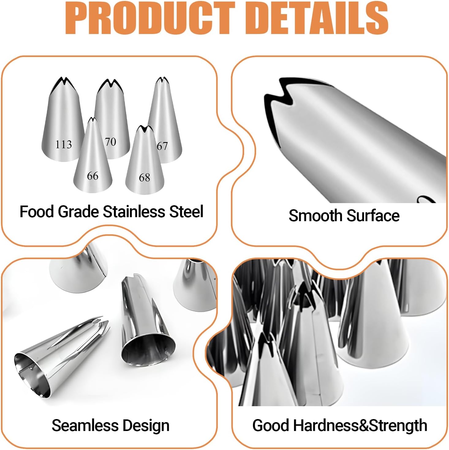 - High-Quality Materials: This flower piping tips is made of food-grade stainless steel, which is resistant to high temperatures and corrosion and very durable. Even after long-term use, this cake piping tips remains bright and new, without worrying about rust or damage. High-quality materials ensure your safety and hygiene during use.