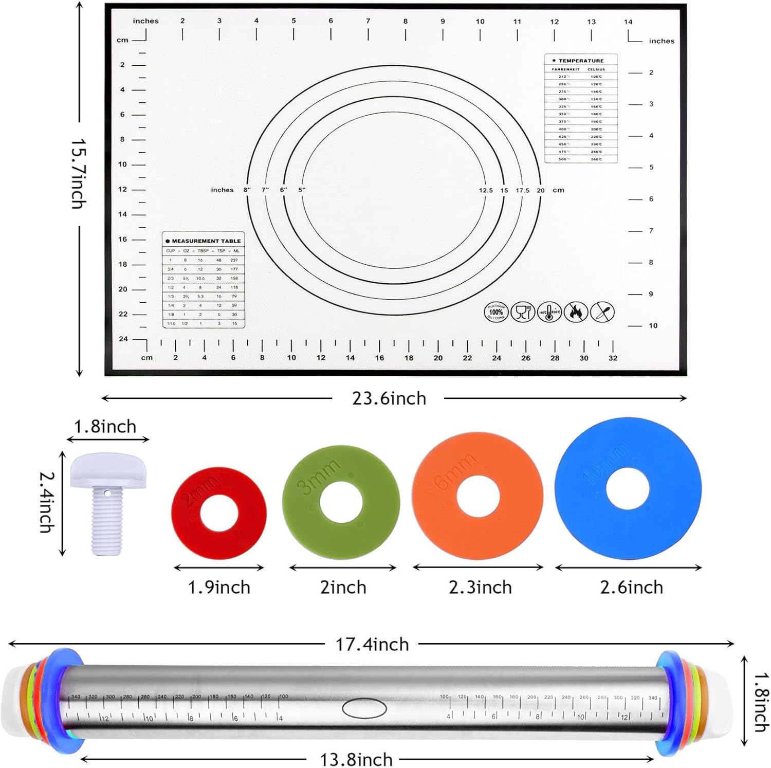 Adjustable Rolling Pin 20 Set and Silicone Baking Pastry Mat Set,Thickness Rings,Dough Roller & Steel Cutter& 6 Cookie Molds & 10 Cake Molds for Baking Dough Stainless Steel Dough Roller, Pizza, Pie