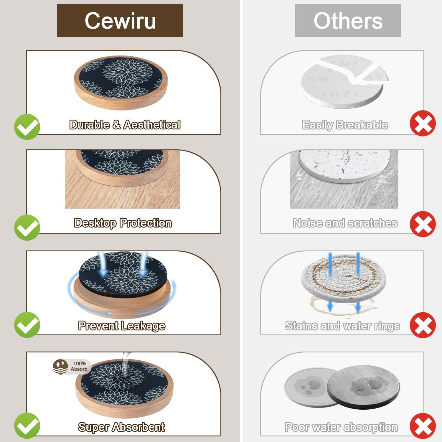 - Non-stick & Coaster with Holder: Cup coaster is thick and flat, good moisture absorption can effectively isolate adhesion forces, prevents coaster from sticking to glasses; durable & aesthetical, non-breakable, suitable for hot and cold drinks, effortlessly protects your furniture, tabletops & counter top, brings your pleasant drinking experience.