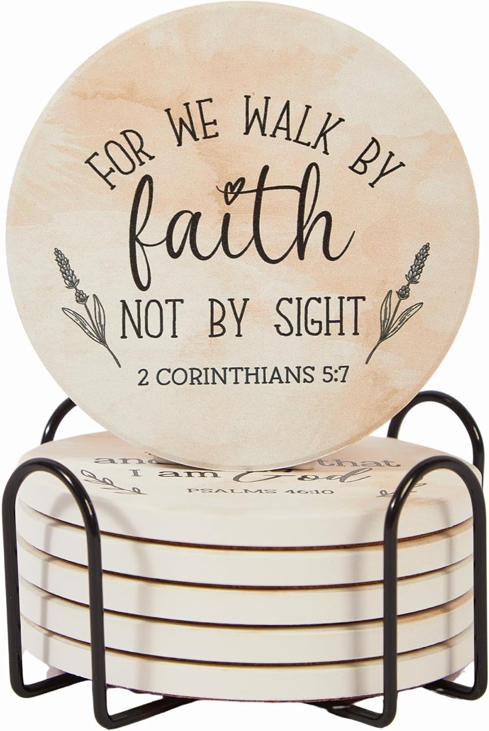 Absorbent Coaster Set of 6 with Holder, Drink Coasters for Coffee Table, Kitchen, Home Decor, Cute Ceramic Round Coasters, Alternative to Silicone, Cork or Glass Coaster (Blessed)