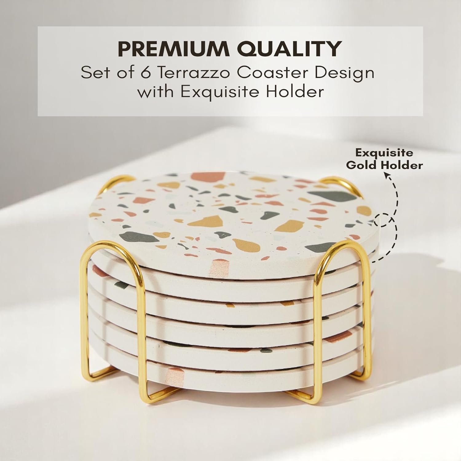 - Minimalism & Elegance: This coasters with holder comes with a gold metal holder for easy storage and 6 marble drink coaster to suit all centerpiece table decor. Our water absorbing coasters are available in green, black, navy blue, white coasters.