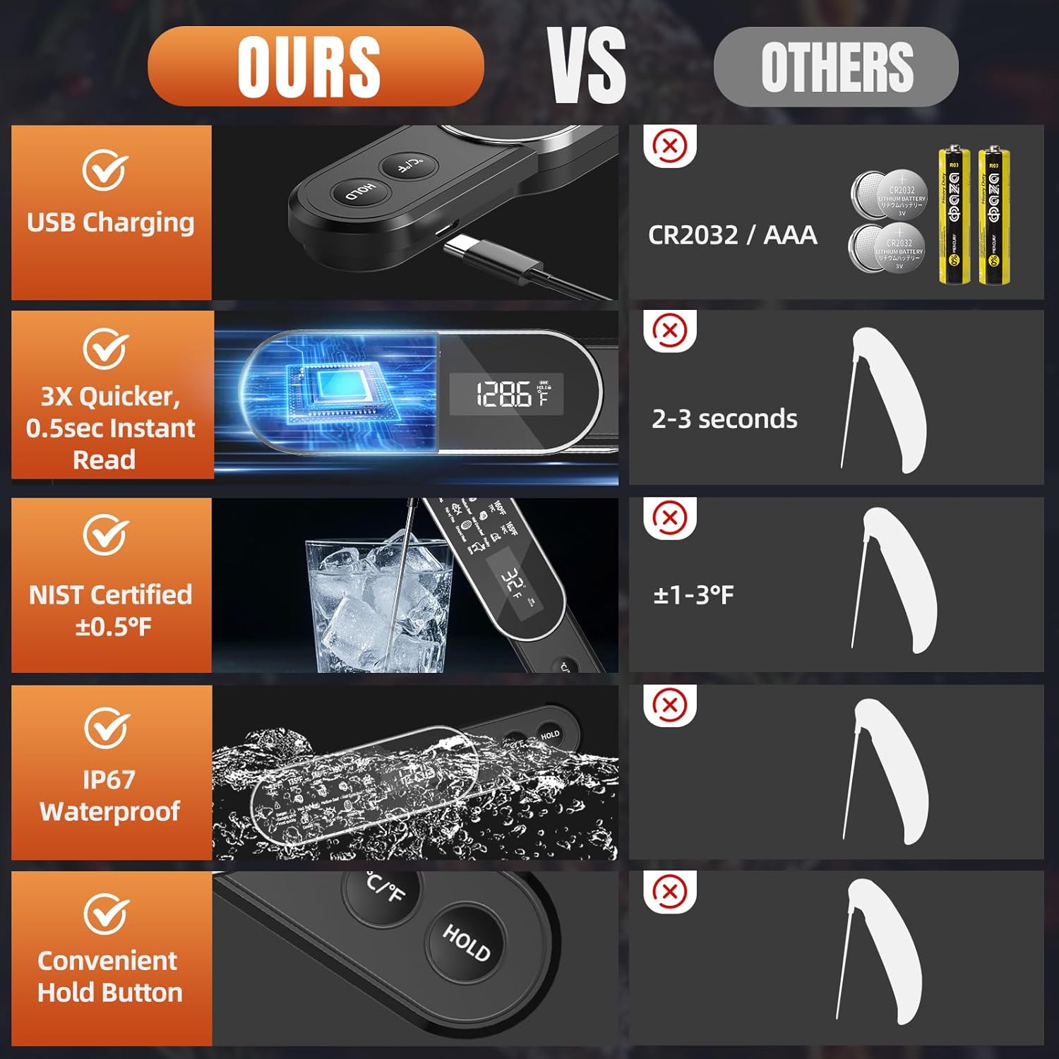 - 0.5sec Instant Read,±0.5°F NIST Certified Accuracy – For any scenario demanding swift temperature data, the instant read meat thermometer delivers precise readings within 0.5 seconds, accurate to ±0.5°F, ensuring reliable measurements every time.