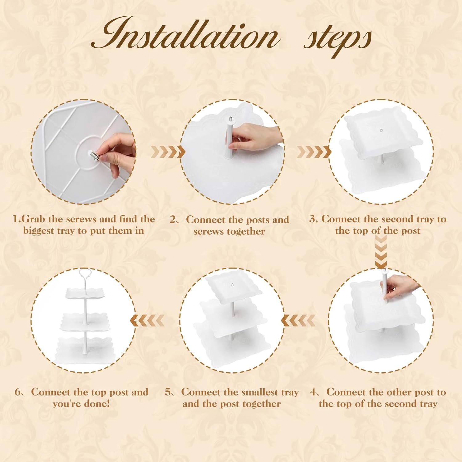 - Tool-Free Assembly: Effortlessly assemble the 3-tier serving tray using interlocking pillars and screw-on connectors, creating a stable structure without tools in seconds.