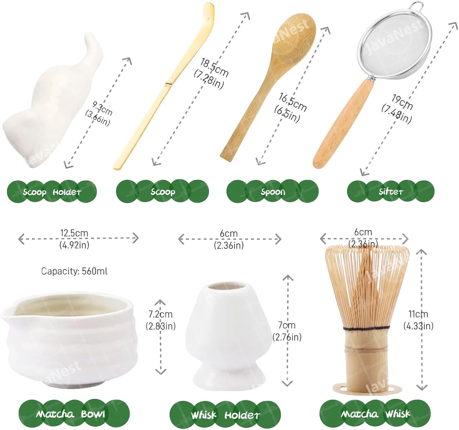 - 🔹【Complete 7-Piece Matcha Starter Kit】 This premium 7-piece matcha set includes everything you need for an authentic matcha experience: a high-quality ceramic matcha bowl with spout, 100-prong bamboo whisk (chasen), ceramic whisk holder, tea scoop (chashaku), wooden spoon, stainless steel strainer, and ceramic scoop holder. Whether you’re a beginner or a seasoned matcha enthusiast, this set provides a seamless and traditional matcha brewing experience