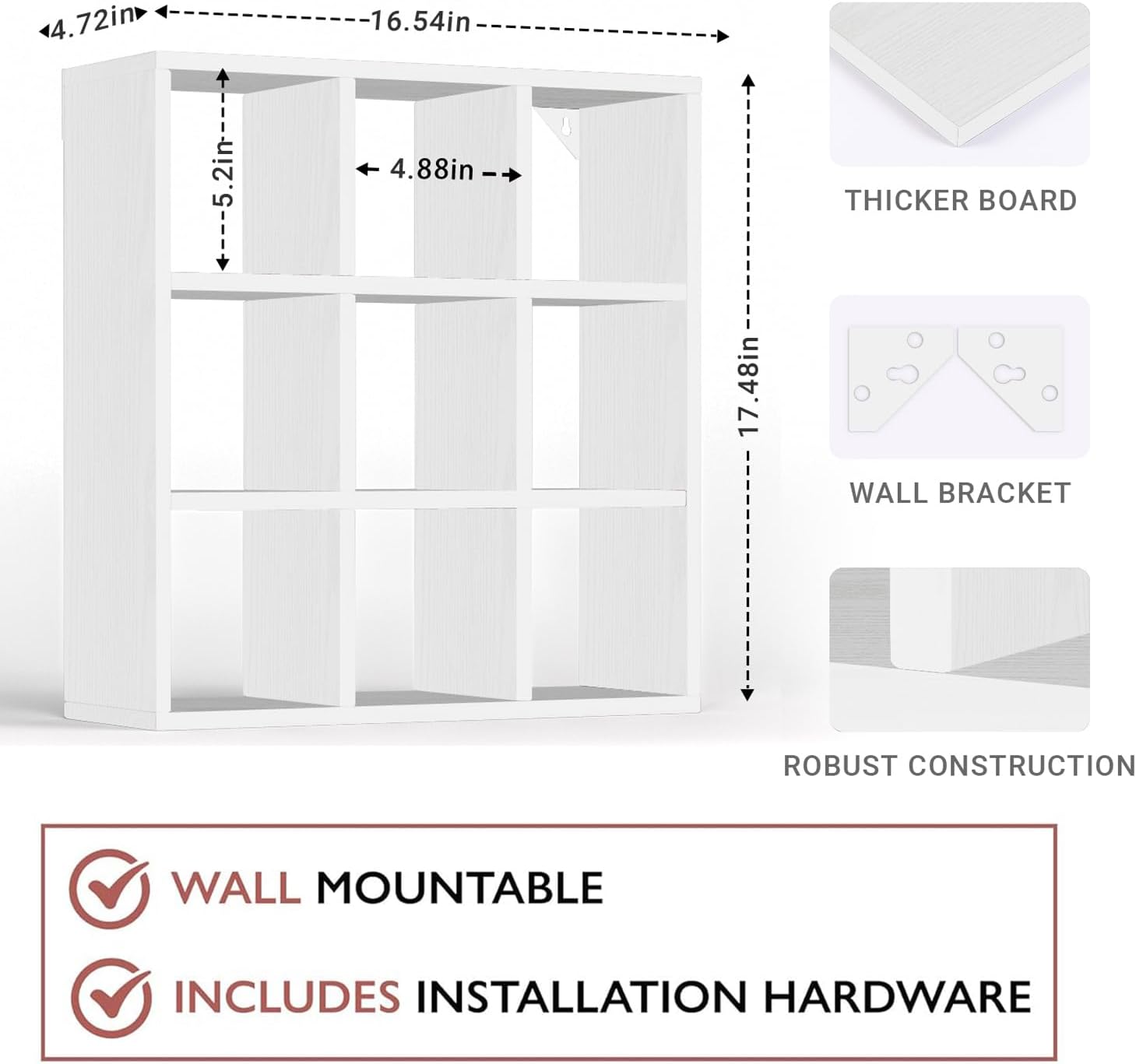 Helsin 9 Grid Vintage Coffee Mug Display Rack, 16inch Wall Mounted Wooden Curio Shadow Box Shelf, Cup Floating Shelves Display and Organizer (White)