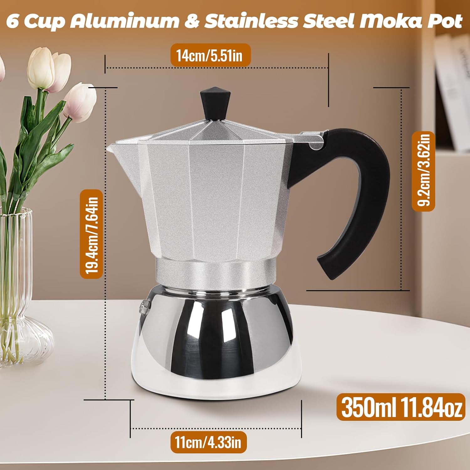 No Coating 6 Cup Aluminum and Stainless Steel Moka Pot Stovetop Espresso Maker Italian Coffee Machine 350ml 11.84oz Suitable for Gas Induction Stovetop Greca Coffee Maker Percolator Silver