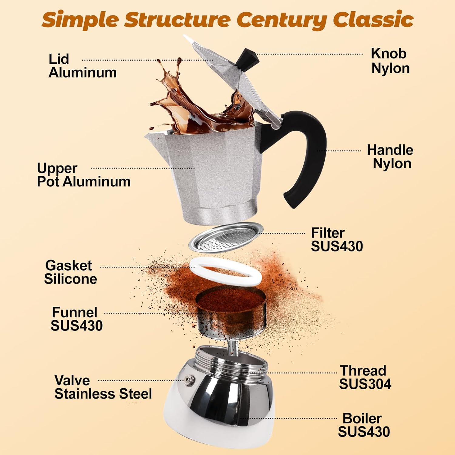 - Polished Uncoated: This espresso pot is different from other moka pots with coated interior, you can see that the lower pot of this moka pot of ours is really made of all stainless steel. The polished and uncoated process allows you to clearly see the actual high quality stainless steel material. Not only is it healthier and safer, but it also avoids the risk of the coating coming off, durable and pure coffee original flavor