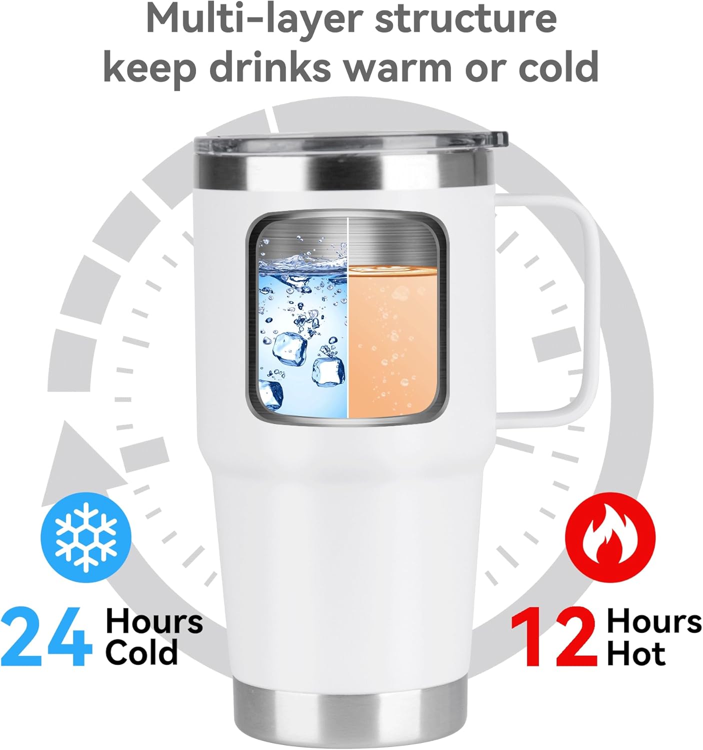 - Stainless Steel Tumblers with Handle: Crafted from thickened 304 stainless steel, this 20oz tumbler is rust-proof and odor-free, ensuring pure taste retention. The welded handle offers a secure, comfortable grip for daily use at home, work, or outdoors.