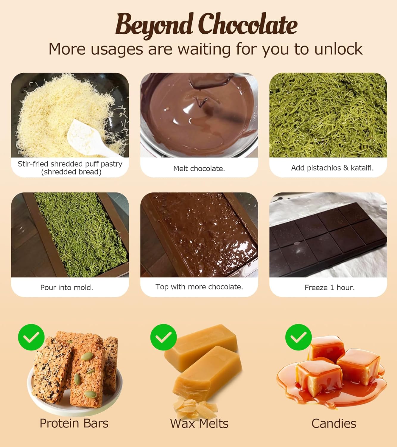 - 【Deep Pistachio Chocolate Bar Mold】- 1-inch thick chocolate bar mold holds ample pistachio kataifi for authentic dubai chocolate bar.