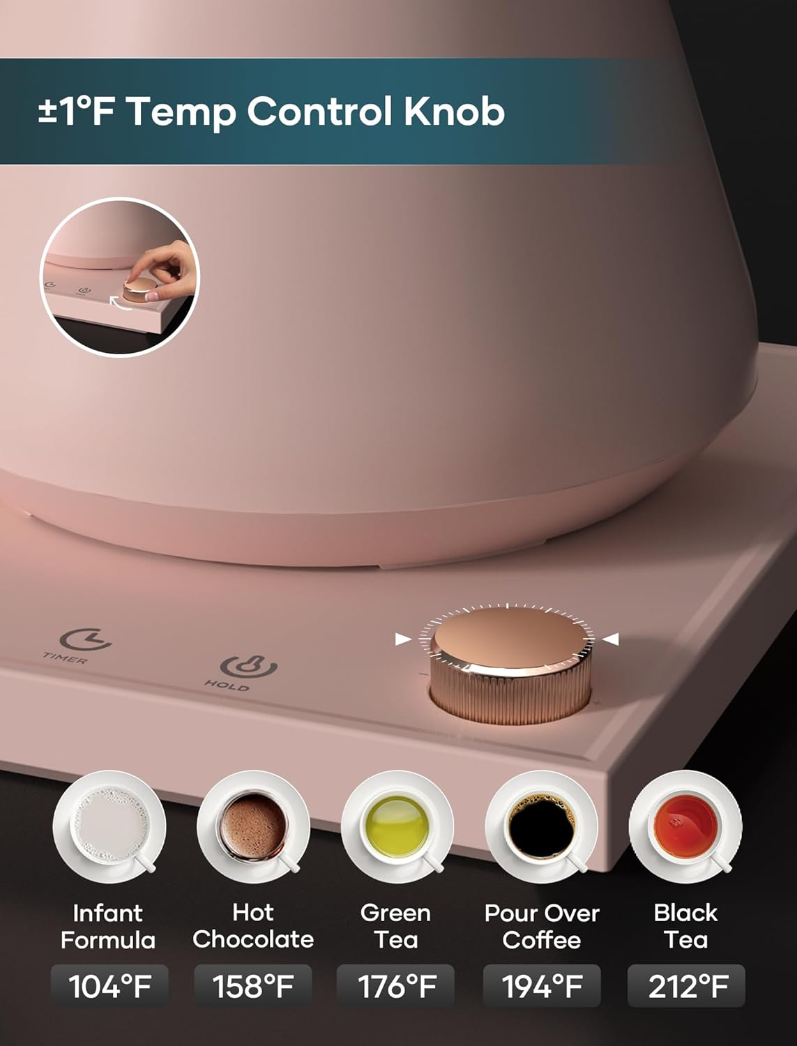 - ±1℉ Temperature Accuracy - The intelligent base's built-in temperature control program. The program will adjust the heating power when the water temp approaches the desired temp according the temp probe detects the temp change.