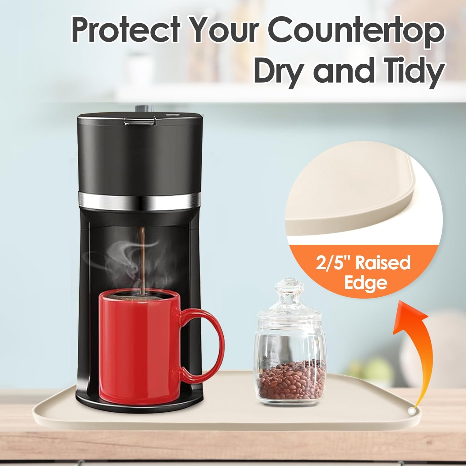 - 100% Water Does Not Flow Out: The coffee maker mat is built with 2/5" raised edge, like a tray and it can contain any liquid spills from the coffee maker. The premium material not only protect your countertop from scratches, especially protect the wood countertop, but also keep your your countertop tidy, clean
