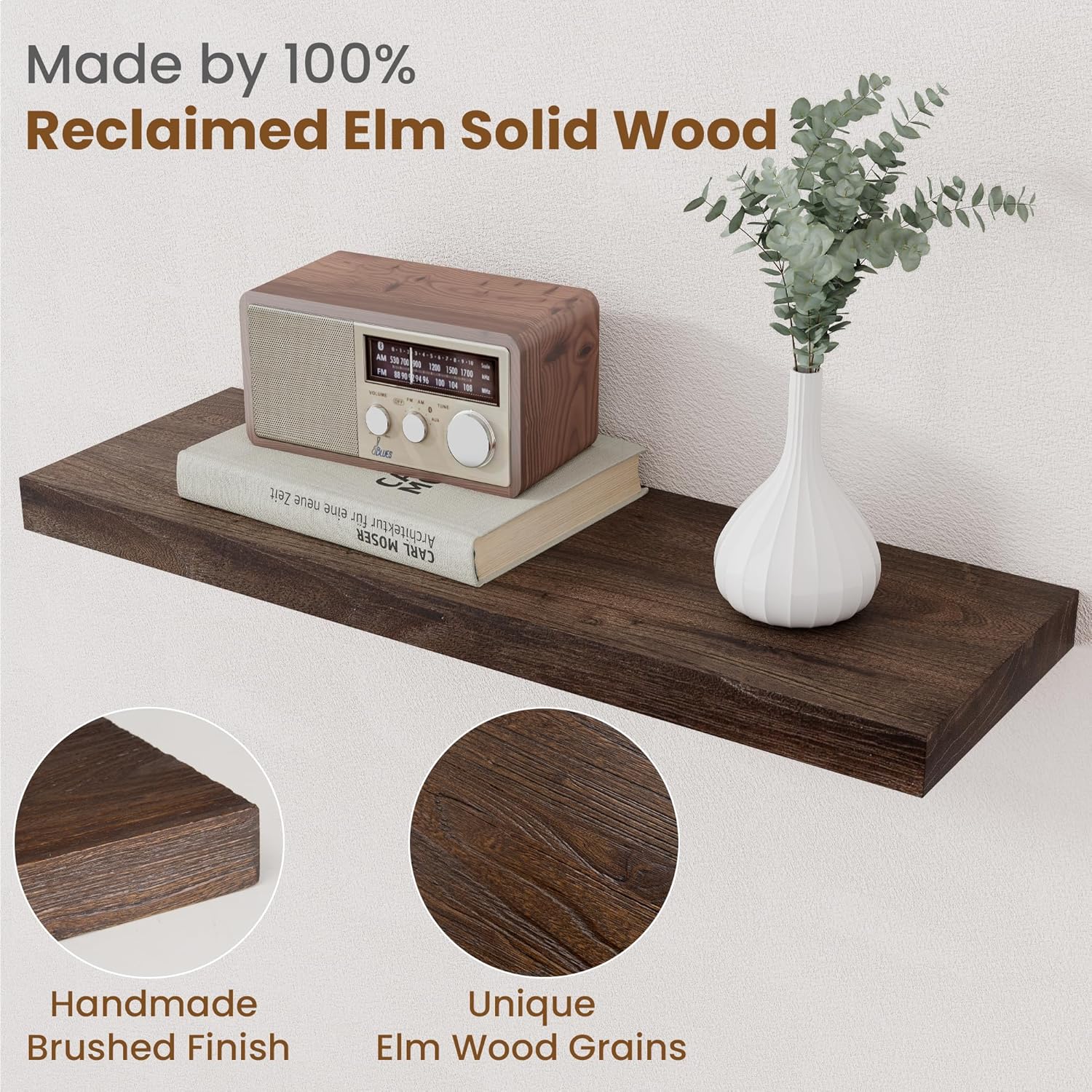 - Solid Elm Wood: Our rustic floating shelves are made of reclaimed elm wood, each floating shelf has a unique natural grain, color, holes, and knots. Don't worry about holes and knots, these are elm itself so you can feel the feeling of nature