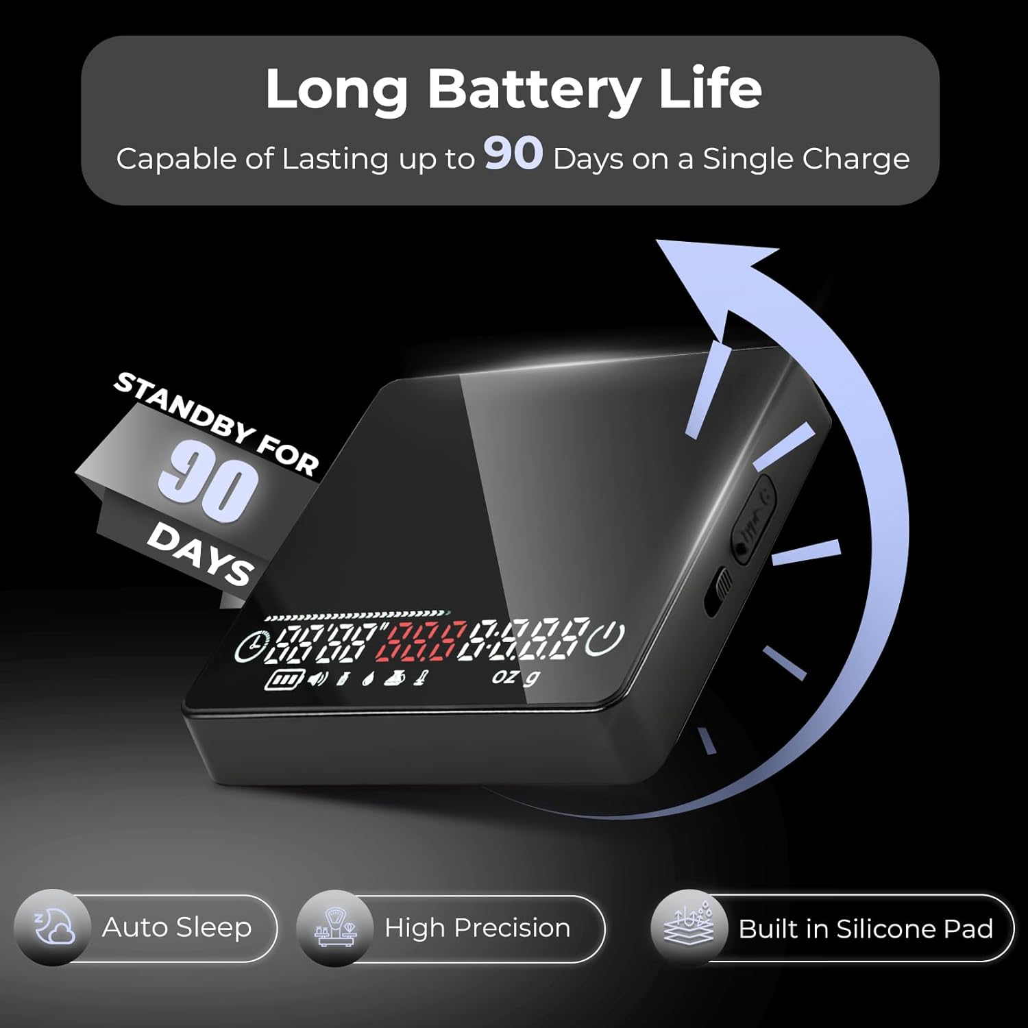 - Clear LED Display & Auto-Timing Function - A large, bright LED screen ensures easy readability. Automatically starts timing in Espresso and Pour-Over modes, allowing you to focus on pouring technique without distractions from phones or separate timers