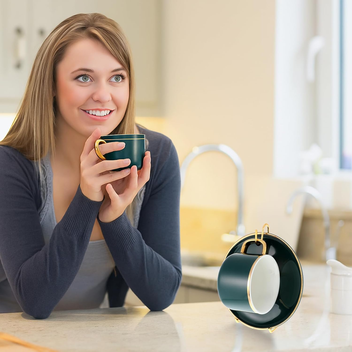 - Elegant Design: Our coffee mug organizer features a sleek gold finish, adding a touch of sophistication to any room. The metal china teacup holder is designed to catch the eye and enhance your home decor