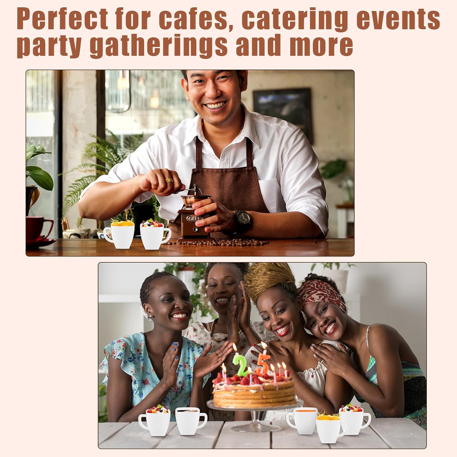 - Save Time: the plastic coffee cups with handles adopt a disposable design, just throwing them after using, saving time and energy for cleaning, you will have more time to enjoy the parties with other people; Besides, you can also reuse or repurpose if you want