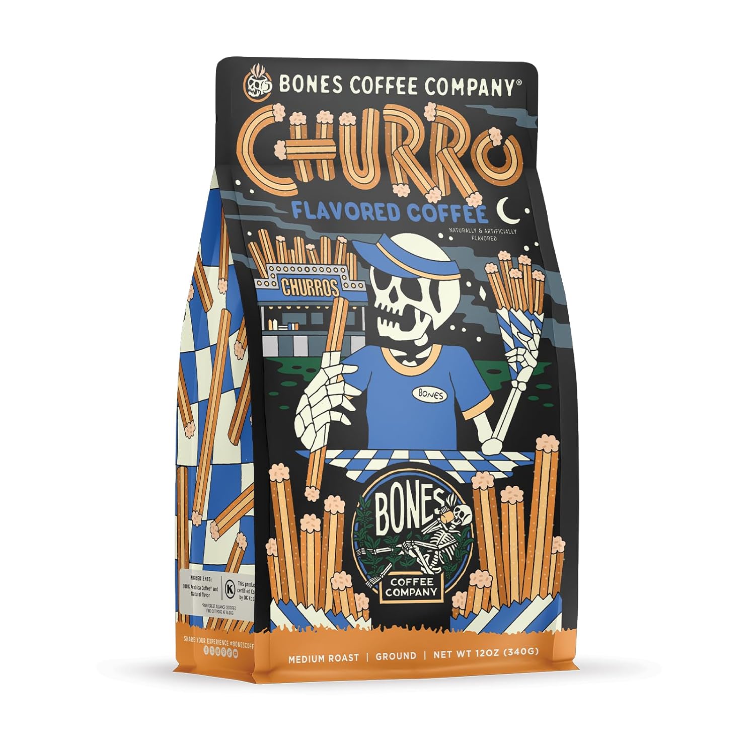 Bones Coffee Company Churro, Sweet Sugary Cinnamon Flavored Coffee, Medium Roast Low Acid Arabica Beans Compatible with Auto drip and French Press Coffee Maker, 12 Oz Ground