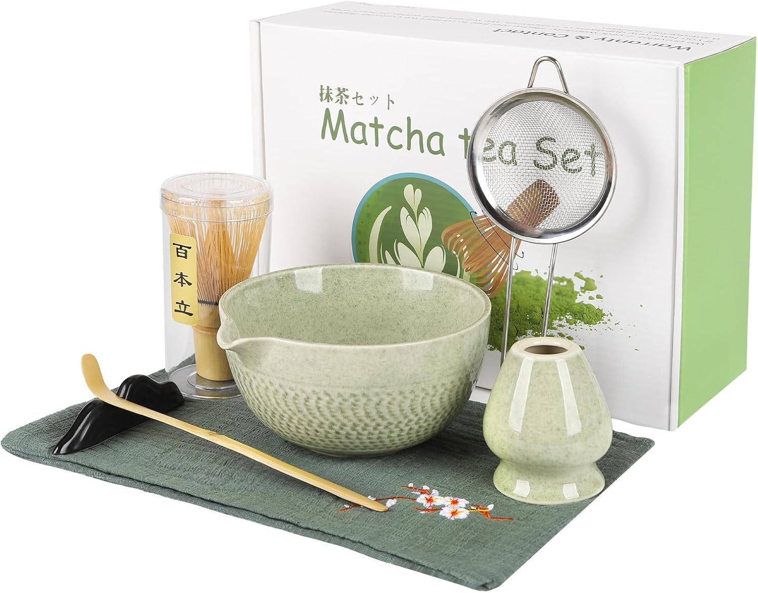 - Complete Matcha Kit: This matcha kit includes essentials for an authentic matcha experience: 1* Bamboo Matcha Whisk, 1* Bamboo Scoop, 1* Scoop Rest, 1* Stainless steel sifter, 1* Ceramic Matcha Bowl (Chawan), 1* Whisk Holder, 1* Cherry blossoms Tea Towel and 1* Hand book. Each tool is crafted with precision, designed to make your matcha lifestyle effortlessly stylish