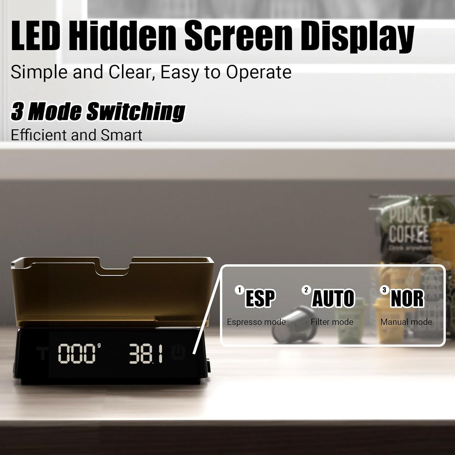 - Smart Multi-Mode Switching & Silent Mode – Equipped with three intelligent modes (weighing / coffee beans & powder input / water input), making it easy to handle different brewing needs. The silent mode is perfect for early morning pour-over coffee, office espresso, or travel use, allowing you to enjoy a quiet and efficient brewing experience anytime.