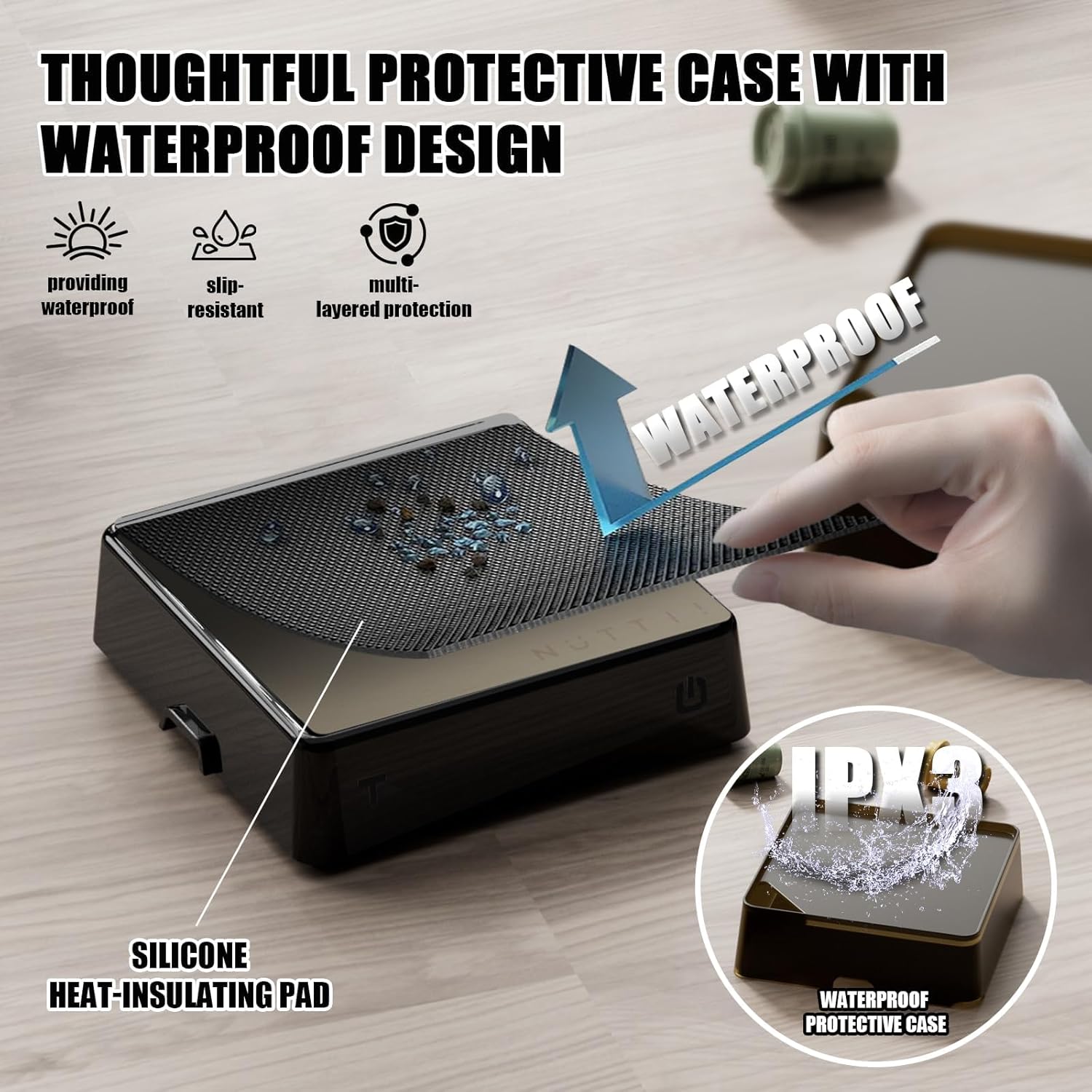 - Waterproof, Durable & Portable Design – Featuring IPX3 waterproof protection and a non-slip silicone heat-resistant pad, the scale resists water splashes and high temperatures, ensuring stability and durability. Compact and lightweight with a reinforced strap for easy carrying and storage. Whether at home, in a café, or outdoors while camping and traveling, you can enjoy precise weighing anytime, anywhere.