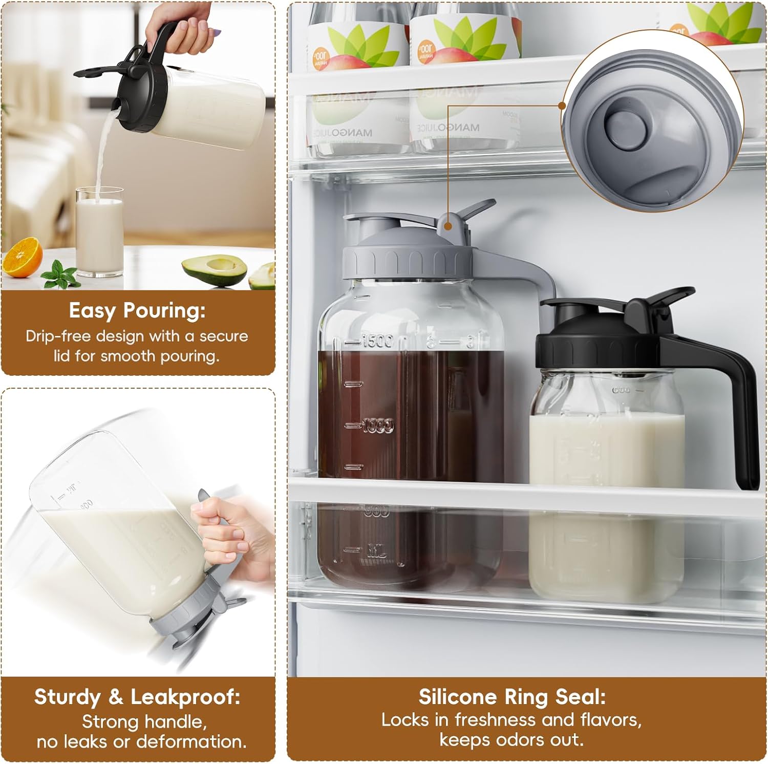 - 【Spout Sealed Lid with Handle】 - The 32oz jug with silicone seal in the pour spout lid, Leak proof and better maintain the freshness and taste of the beverage, avoid mixing the smell of other foods in the fridge. The flip-top lid is easy to pour and the jug is securely fastened to the lid
