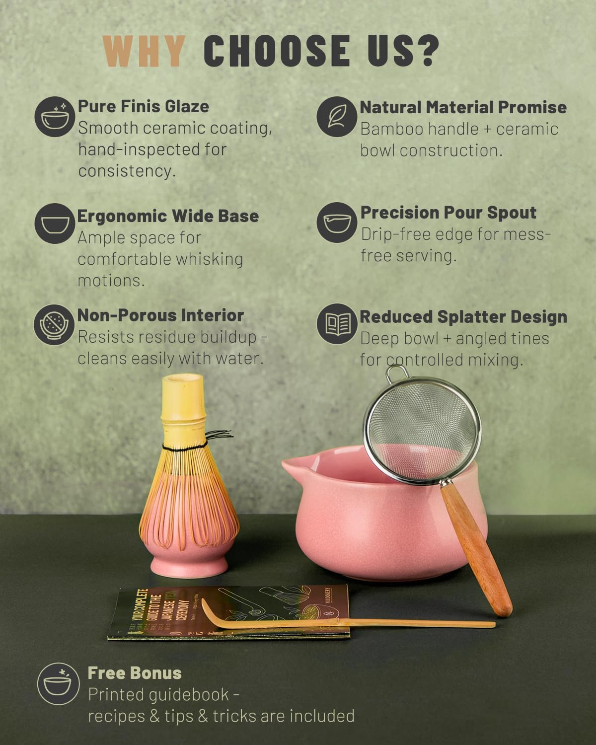 - 🍵【Blossom-Kissed Serenity】Our kiln-transformed pink set captures the ethereal glow of cherry blossoms at dawn. Each ceramic chawan blooms with delicate glaze variations, like petals touched by morning dew. This tactile poetry infuses your tea ritual with gentle vitality—a harmony of ephemeral beauty and mindful presence. Plus, enjoy a complimentary printed handbook filled with recipes, tips, and tricks to elevate your matcha journey.