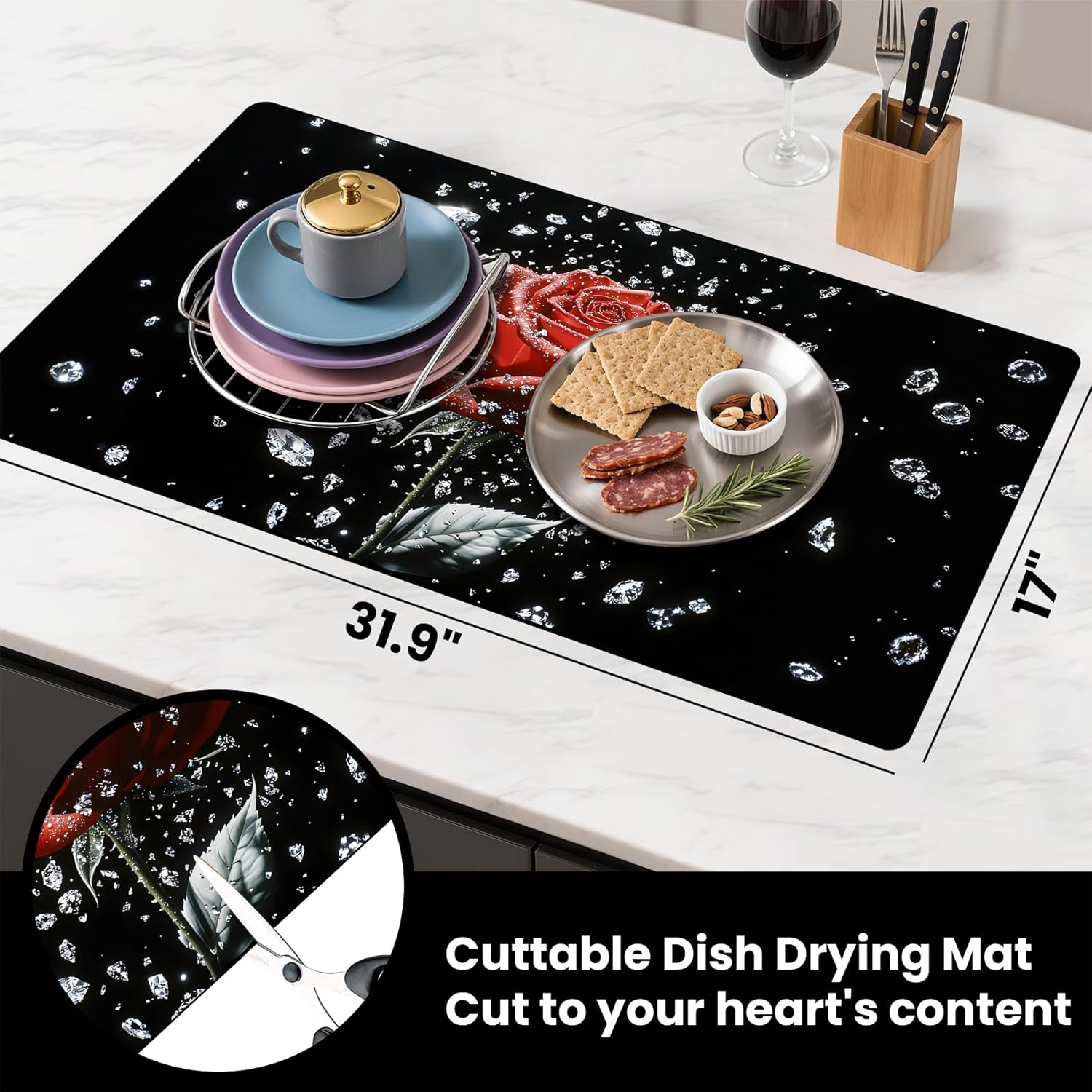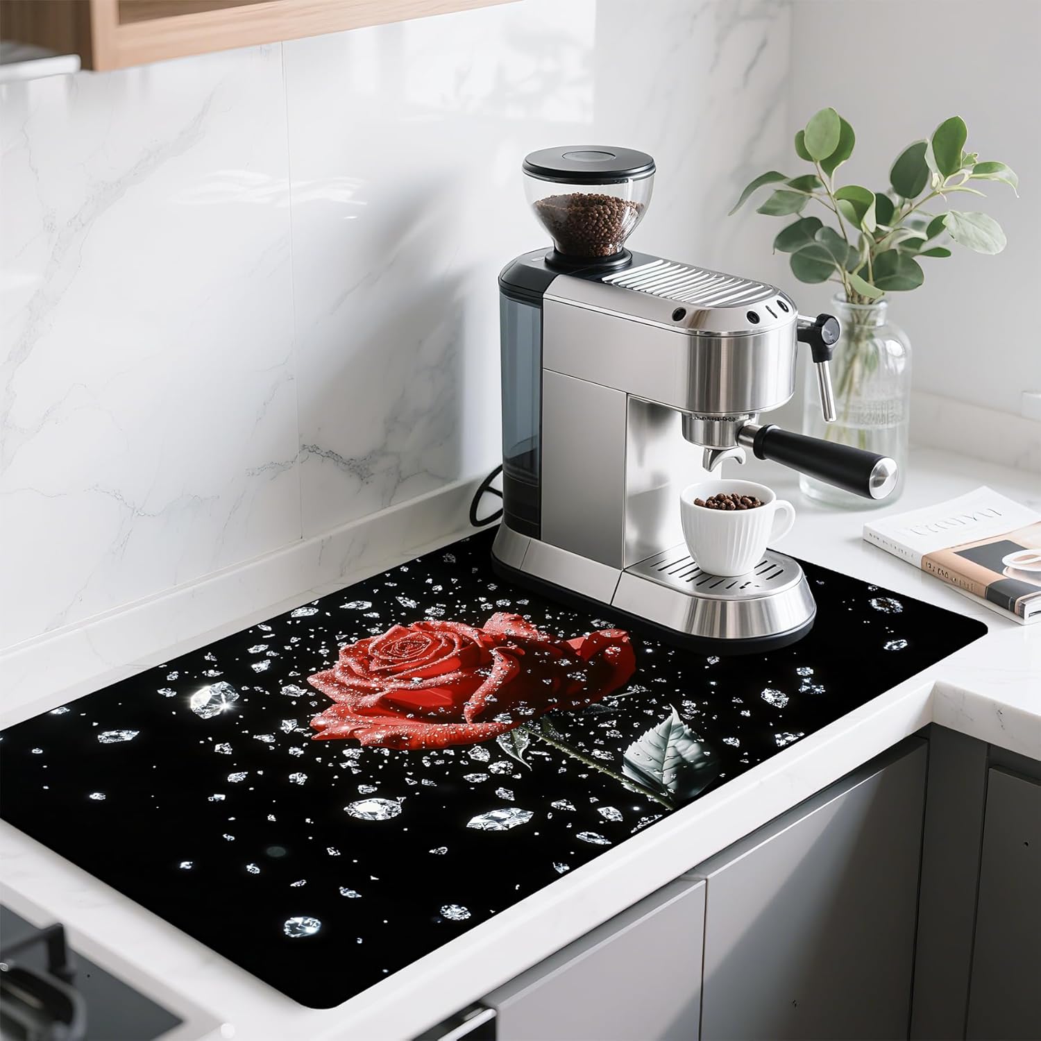 17"x 32" Coffee Bar Mat, Red Rose Absorbent Dish Drying Mat Cuttable Hide Stain Draining Table Pad for Kitchen Counter, Coffee Bar Accessories