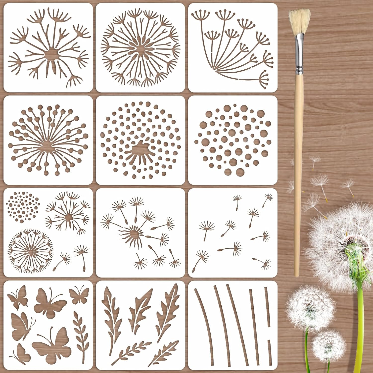 12PCS Large Flower Stencils for Painting 12 x 12 Inch Dandelion Stencil with Brushes Dandelion Floral Stencils for Wood Fence Butterfly Paint Template for Walls Garden Fence Furniture