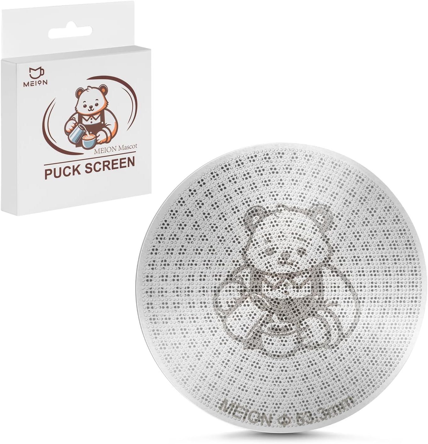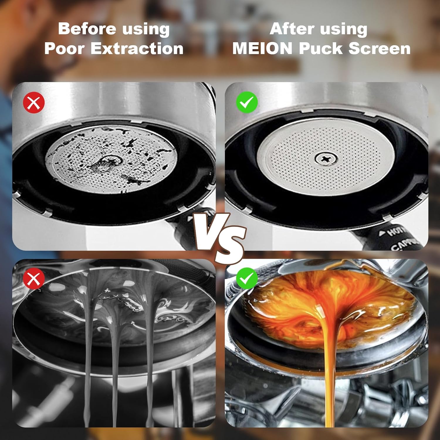 - 【Improved performance】0.8mm Ultra-Thin Dual-Layer Design, MEION 53.3mm espresso puck screen features optimized perforations that evenly disperse water across your coffee pack. It prevents channeling, boosts extraction stability, and delivers barista-quality consistency in every shot.