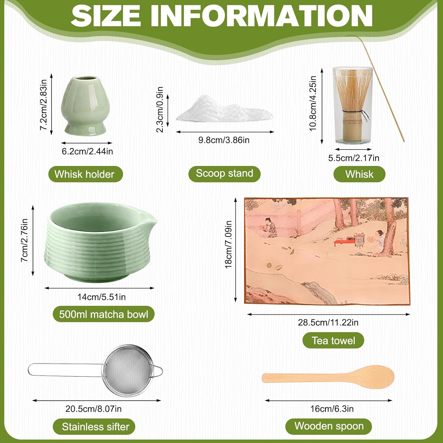 - 8PCS Matcha Whisk Set:The matcha kit includes everything needed to make the perfect matcha, 1*Ceramic Matcha Bowl with spout, 1*chasen holder, 1*bamboo whisk, 1*bamboo scoop, 1*wooden spoon, 1*stainless steel sieve, 1*tea cloth, and 1*stand. Perfect for beginners and enthusiasts seeking a traditional Japanese matcha set. The perfect set to start your matcha journey!