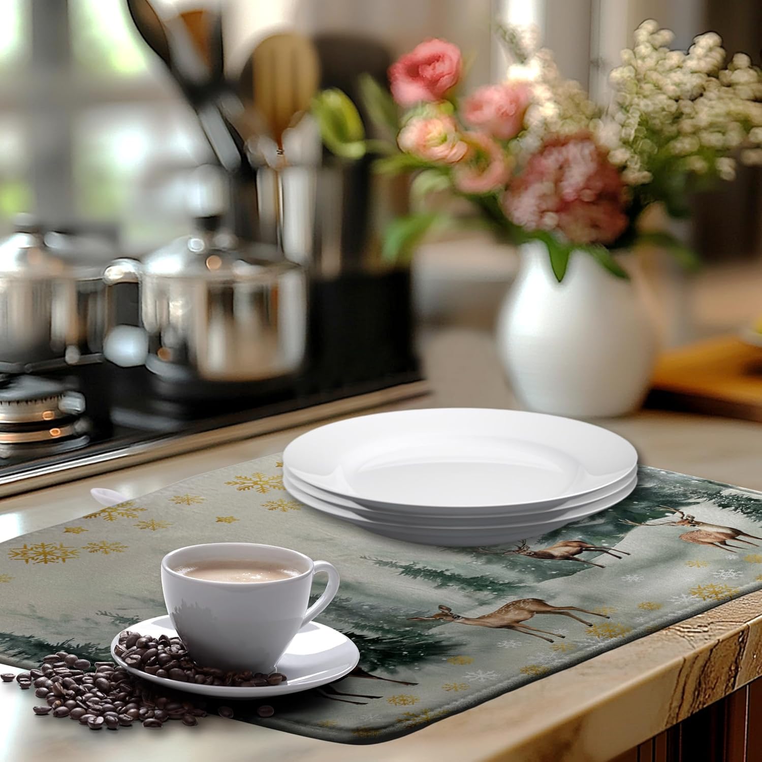 - [Quick Absorption]: Made of absorbent material, our Winter Deer Snowflakes dish drying mat Christmas Large kitchen mat dish dryer mat for kitchen absorbs water stains quickly, keeping your table top dry and clean, avoiding water stains and leaks, providing you with a pleasant and dry dining or working experience.