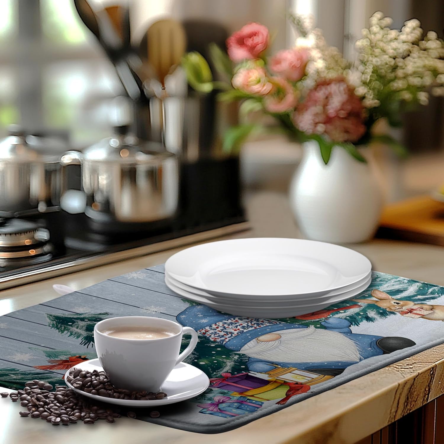 - [Multi-functional]: This Winter Gnomes dish drying mat can be placed under the dish rack to collect dripping water to keep the counter dry and clean, or you can place bottles, pots, plates, bowls, cups and other utensils directly on the mat. Winter Red Bird Large dish drying mat can also be placed under the coffee machine to absorb spilled coffee.