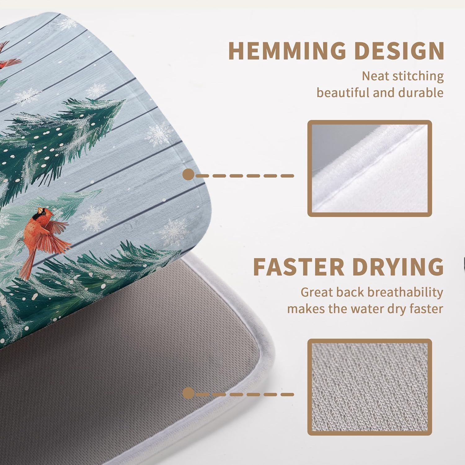 - [Space Saving]: This Winter Cardinal Birds lightweight absorbent dish drying mat has a webbing lanyard in the middle of the horizontal side for hanging, and large drying mat for kitchen counter Christmas Snow Forest dish drying matt kitchen counter can also be folded and thrown into a drawer or stuffed elsewhere.