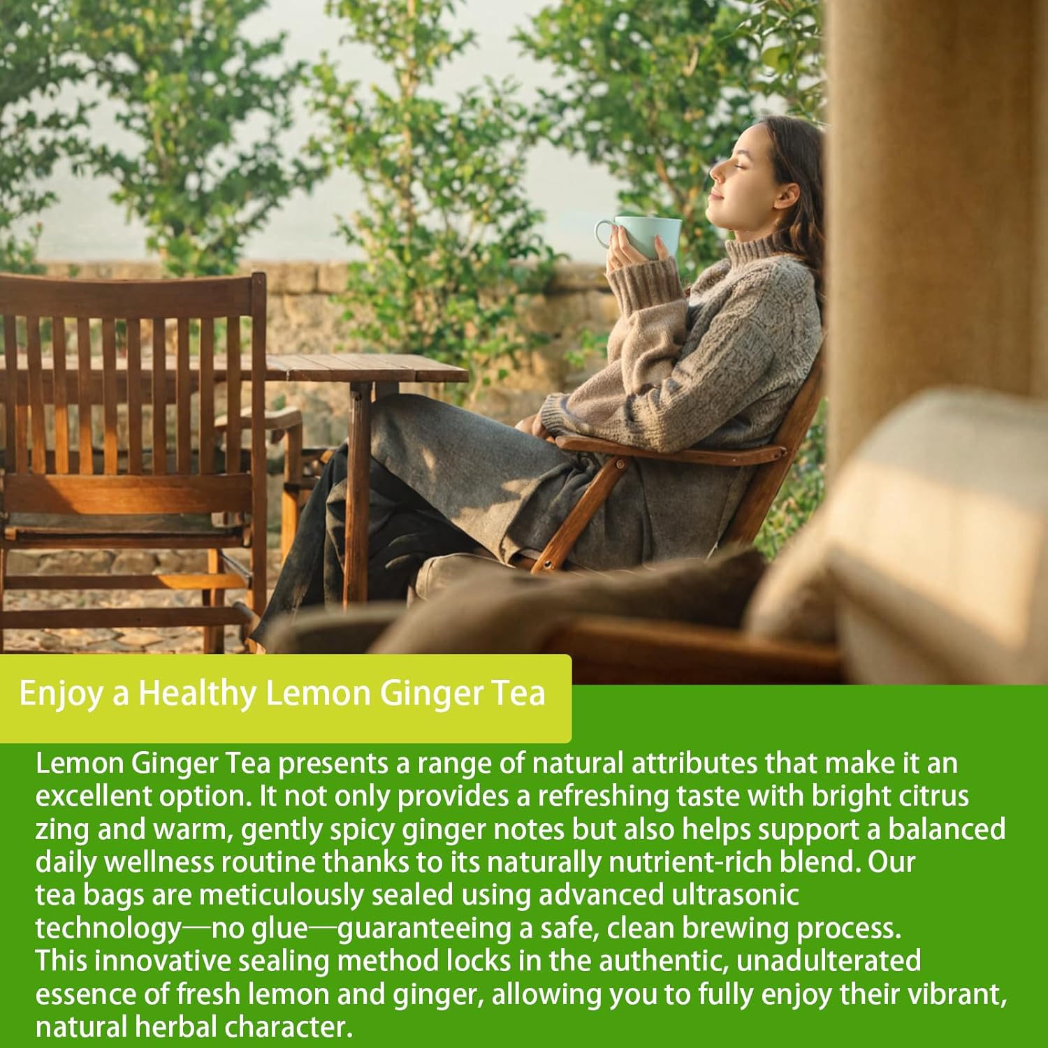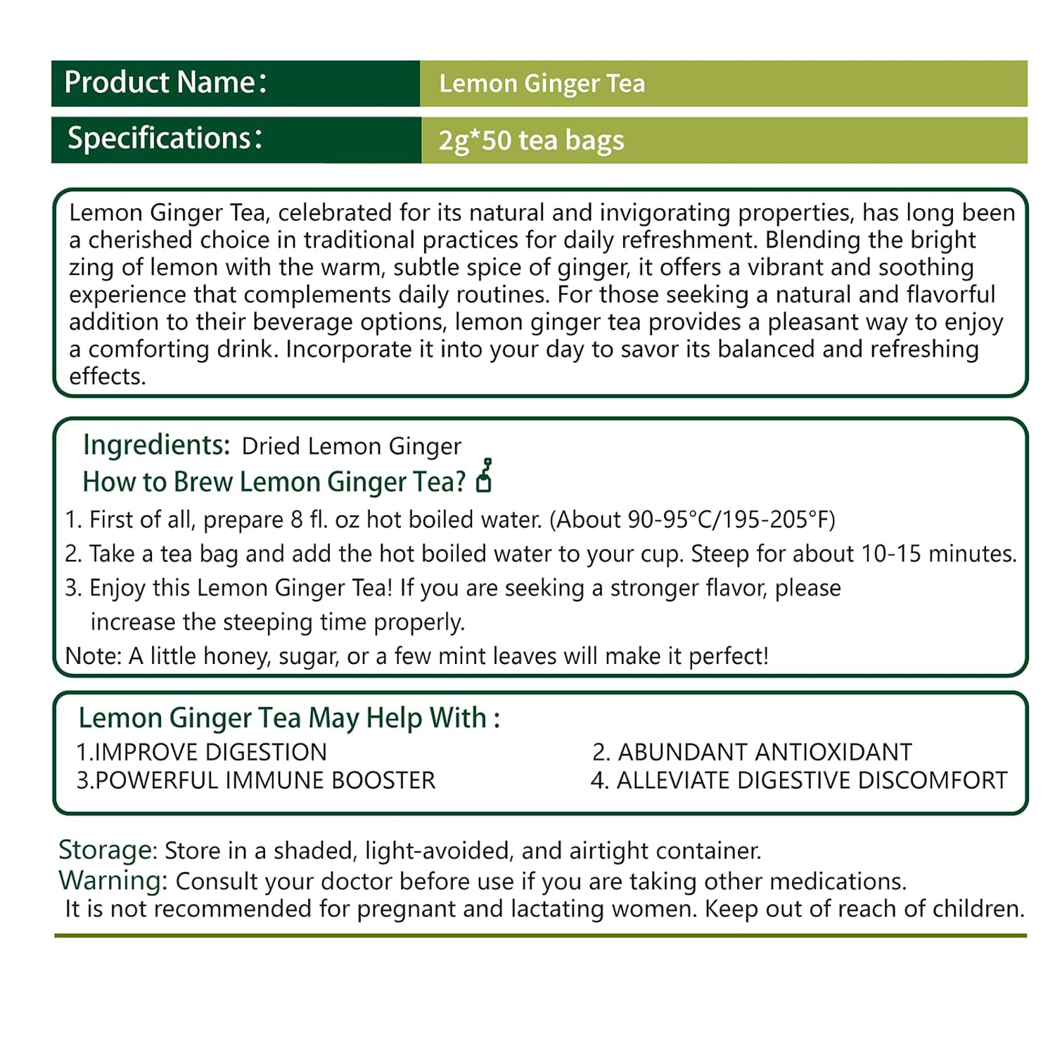- Health Guardian: Crafted from nature's finest, lemon ginger tea offers a comforting blend rich in natural goodness. Its nutrient-rich profile supports overall wellness, helping to soothe occasional discomfort and promote gentle digestive care—making it a thoughtful addition to your daily routine.