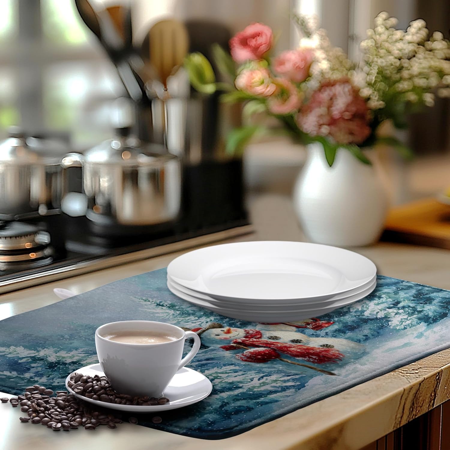 - [Quick Absorption]: Made of absorbent material, our Winter Blue Snowman dish drying mat Christmas Large kitchen mat dish dryer mat for kitchen absorbs water stains quickly, keeping your table top dry and clean, avoiding water stains and leaks, providing you with a pleasant and dry dining or working experience.