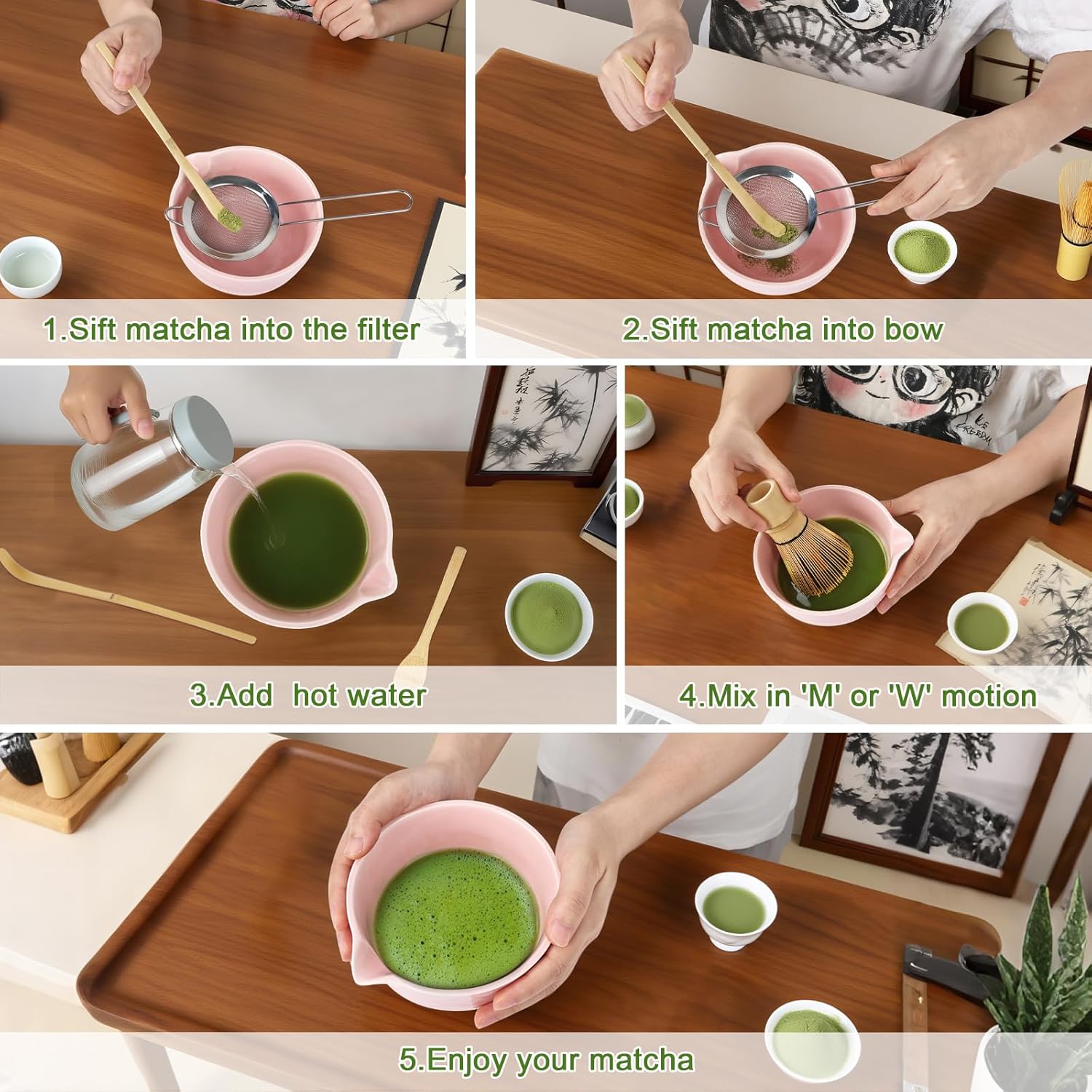 - Mountain Carved Design: This matcha whisk set is inspired by the natural beauty of spring. We have fused the crisscrossing beauty of mountains with natural textures. Through harmonious, dynamic, and symbolic visual elements, this creates a tranquil and elegant tea-drinking atmosphere, enhancing the artistic appeal of the entire matcha set.